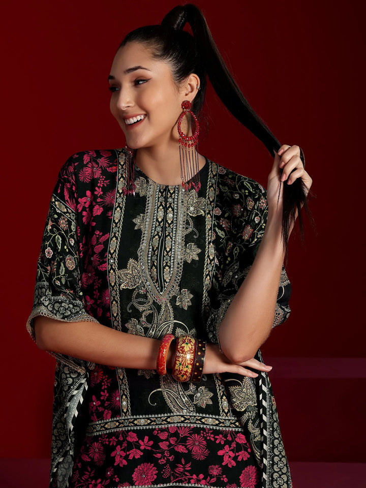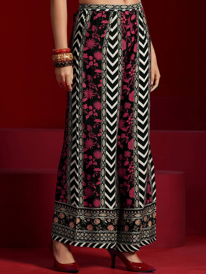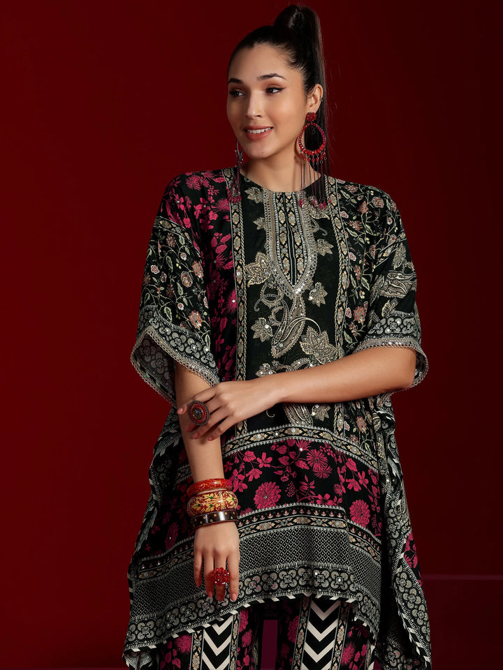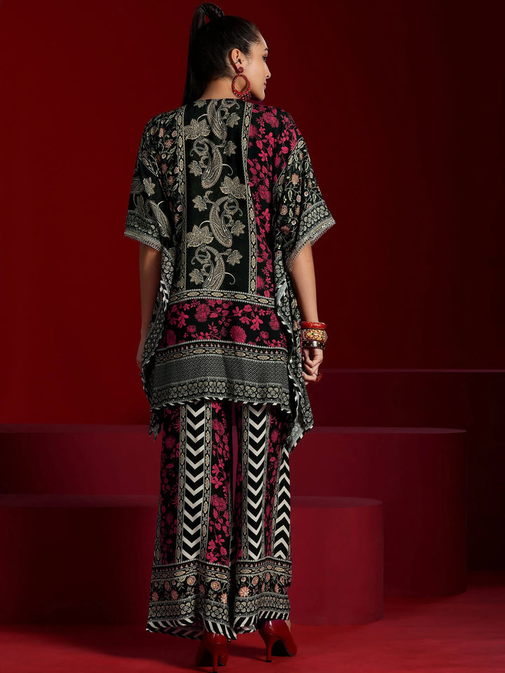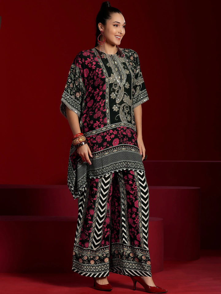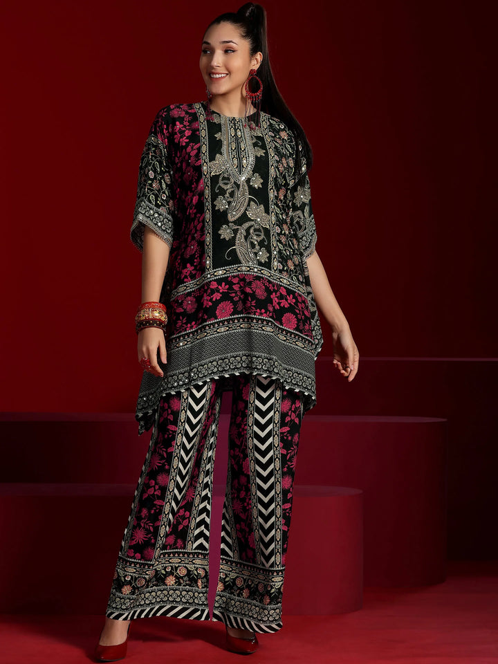 Our 2-piece Black, Pink printed Muslin co-ord set features an Asymmetric Tunic with a Round Neck neckline and Short Sleeves. Complemented with matching Palazzos with an Elasticated waistband. Highlighted with Printed, this style is perfect for Dark Festive.