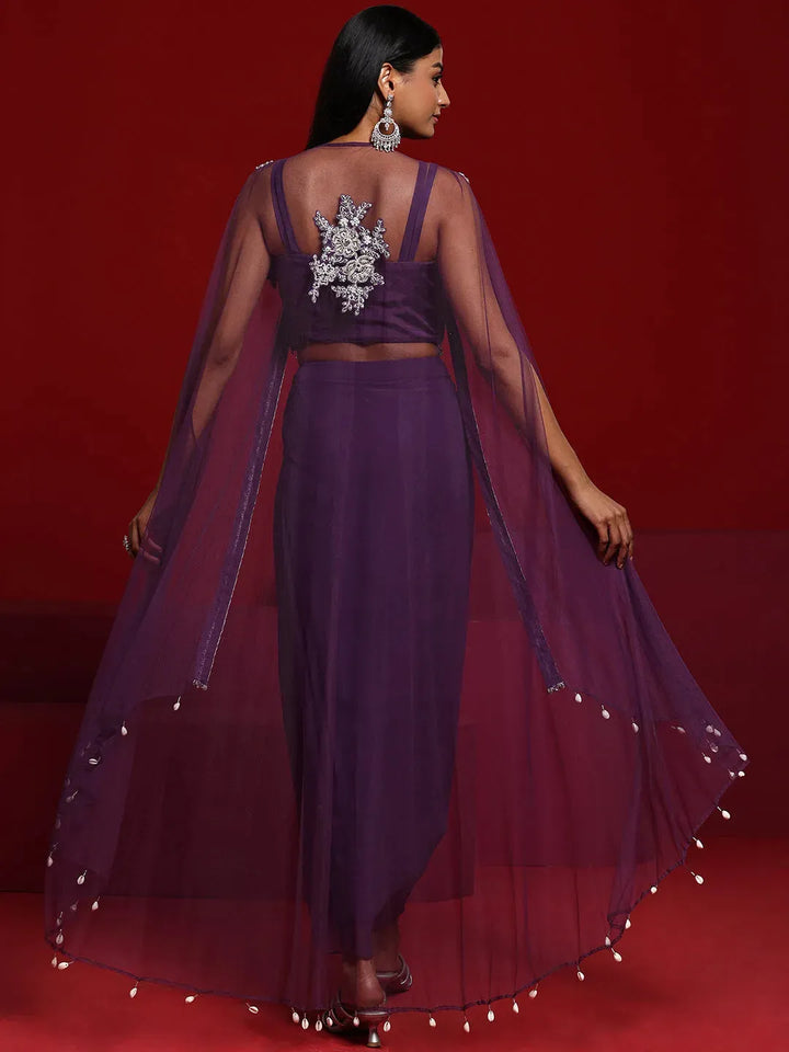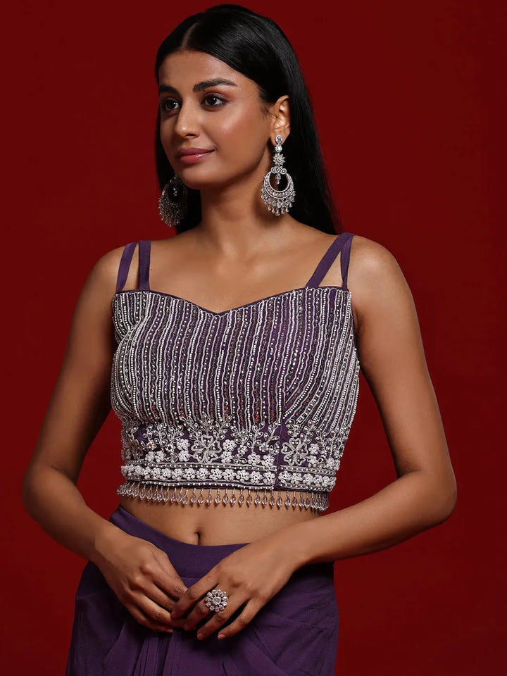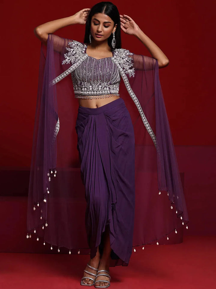 Our 3-piece mauve embroidered silk blend co-ord set features a sleeveless crop top with a sweetheart neckline. Complemented with a mid-rise draped skirt and shrug. Adorned with sequins, beads, tassels, and intricate thread work, this style is perfect for festive celebrations.