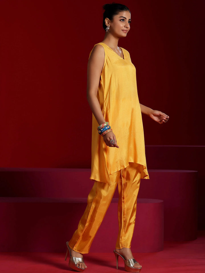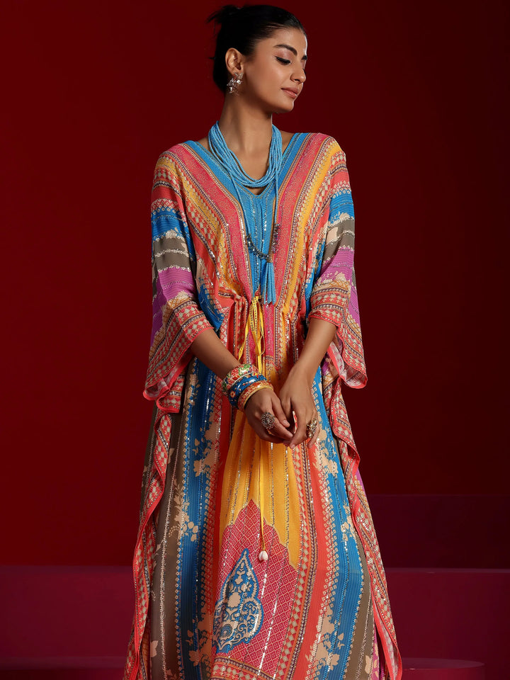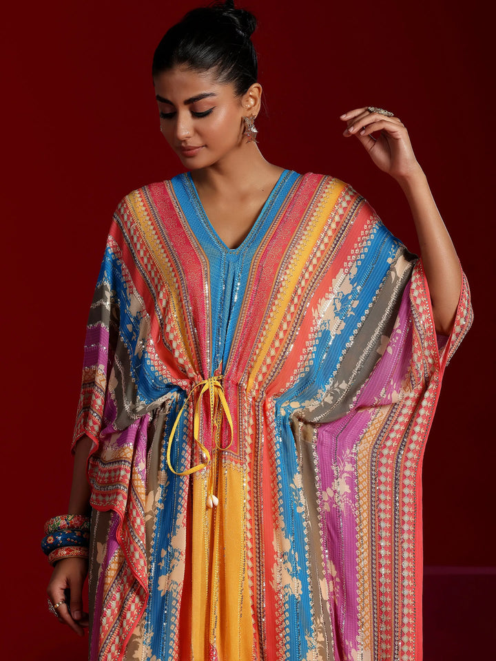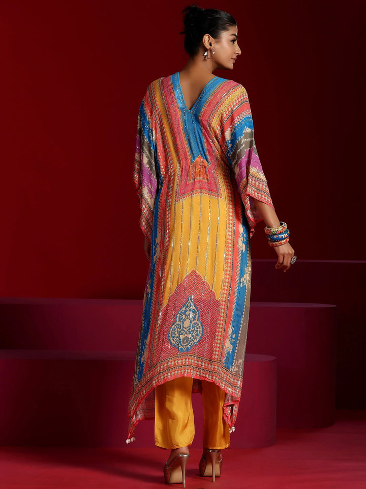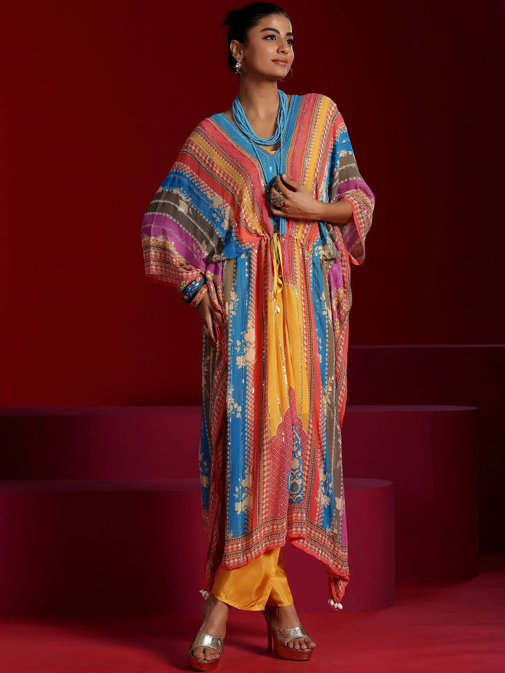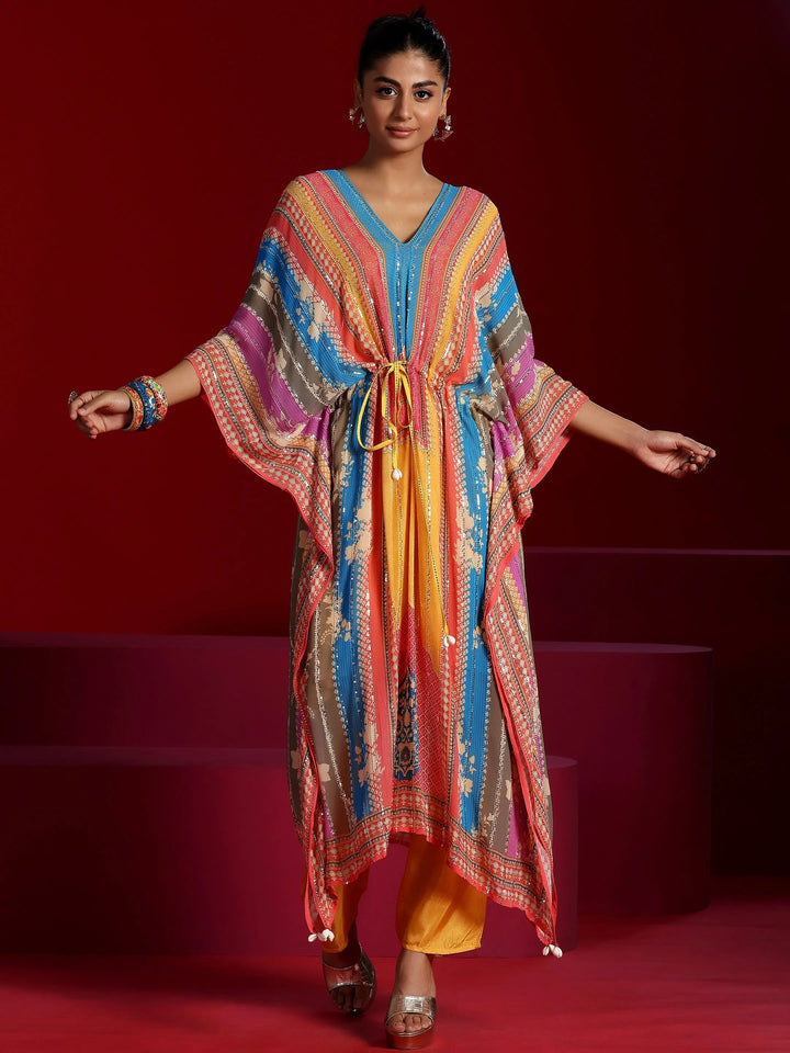 Our 2-piece multi printed Poly Georgette co-ord set features a straight-fit kaftan with a V-neck neckline and short sleeves. Complemented with matching palazzos with an elasticated waistband. Highlighted with printed embellishments, this style is perfect for festive occasions.
