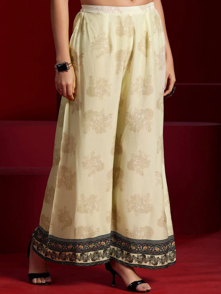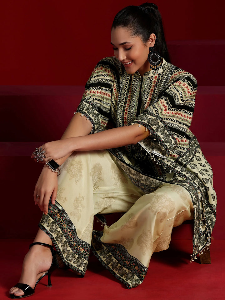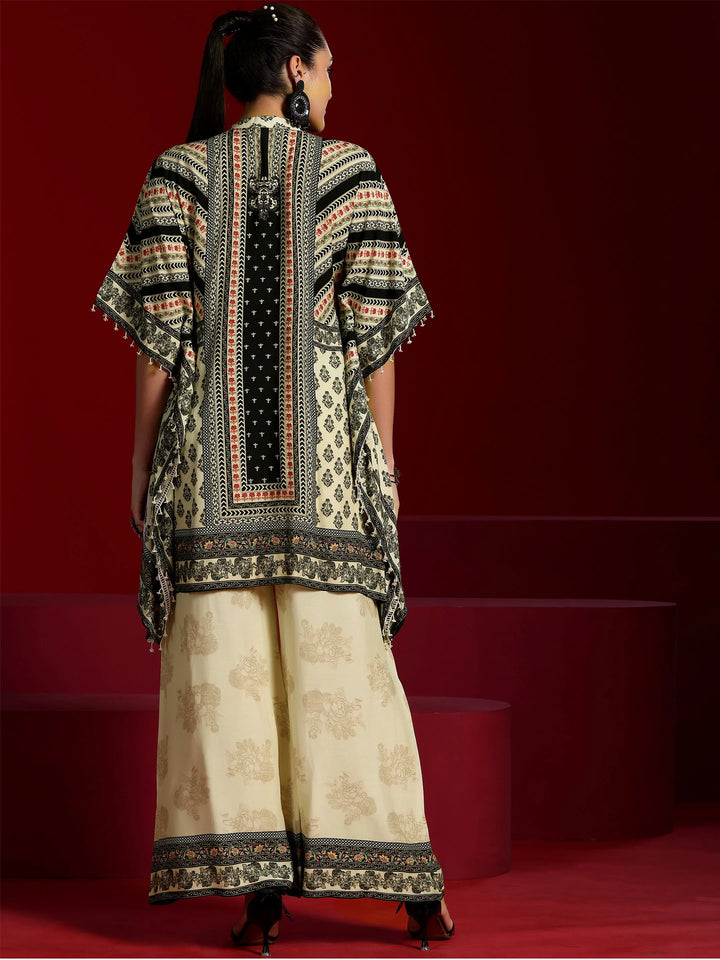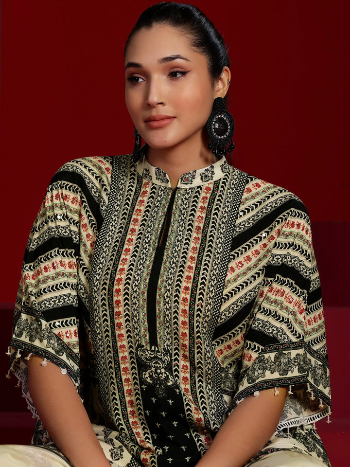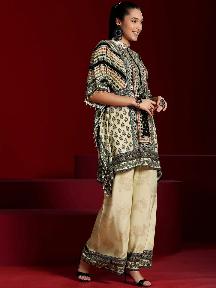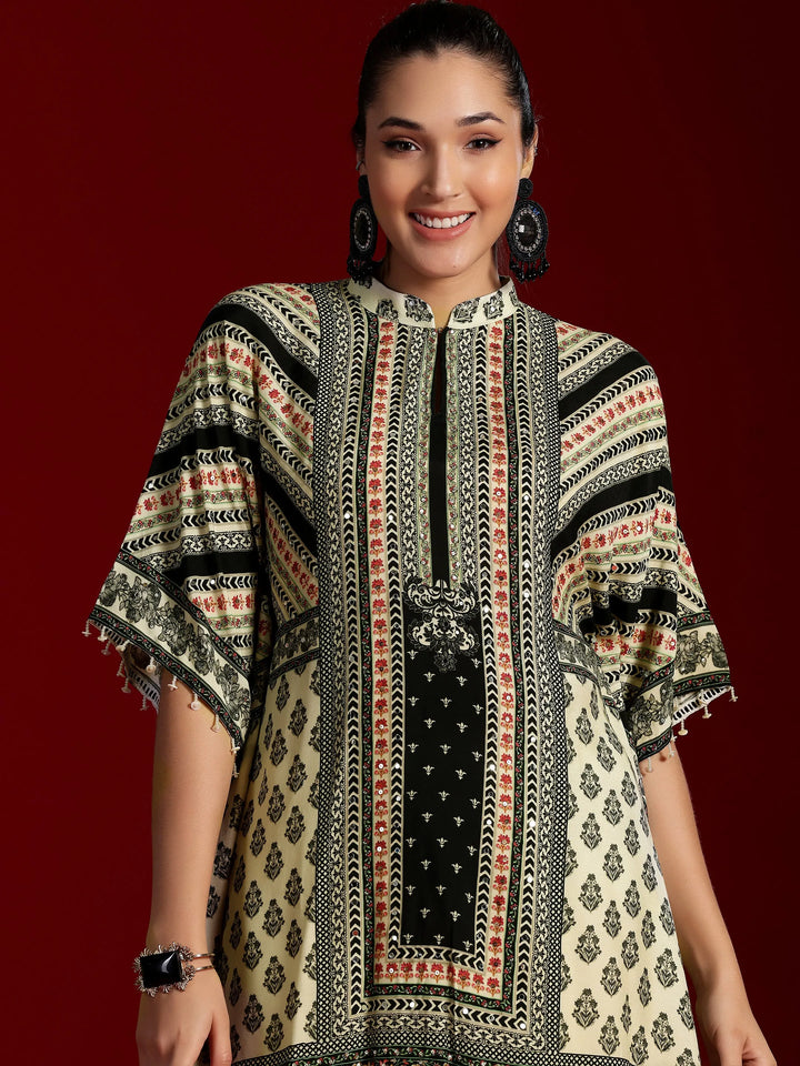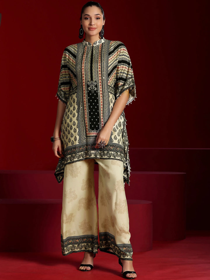 Our 2-piece Black printed Muslin co-ord set features a Straight-fit Tunic with a Mandarin Collar neckline and Three-quarter sleeves. Complemented with matching Palazzos with an Elasticated waistband. Highlighted with Printed, this style is perfect for Festive.