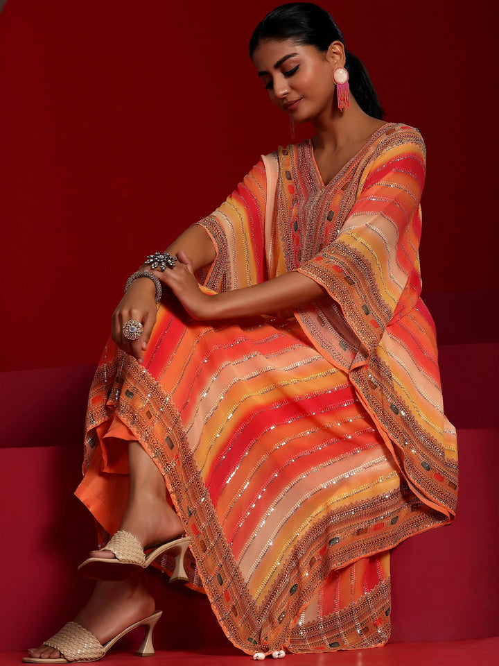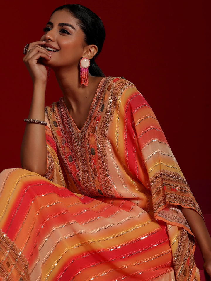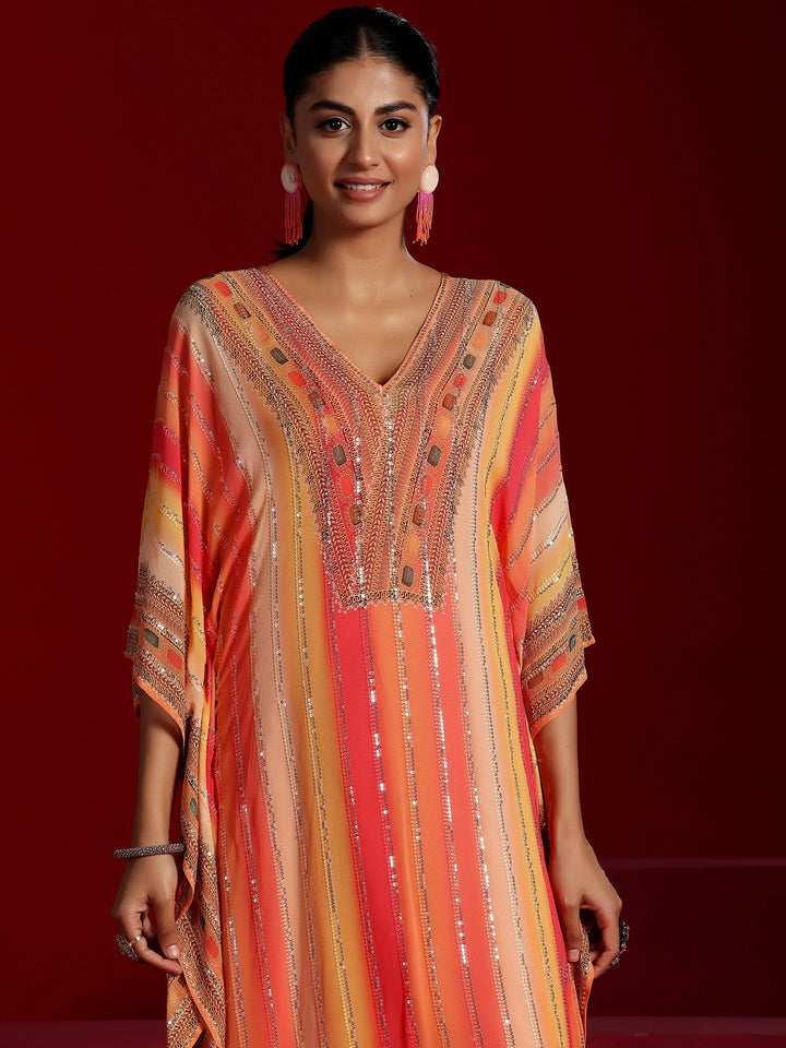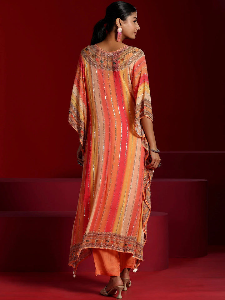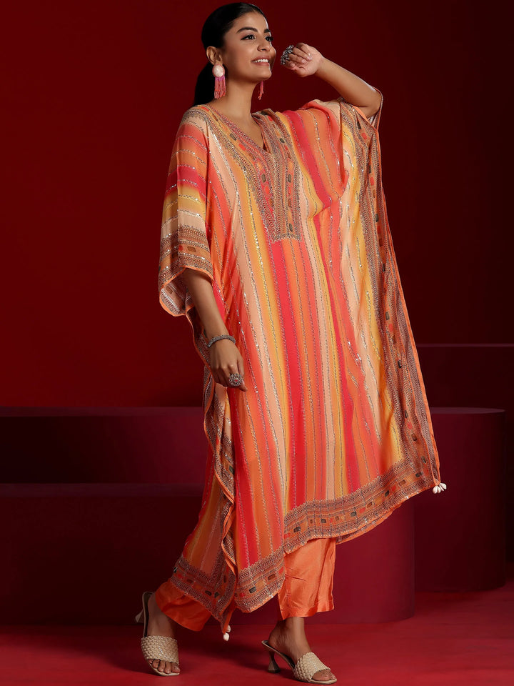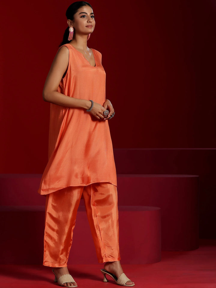 Our 2-piece Orange printed Poly Georgette co-ord set features a Straight-fit Tunic with a V-Neck neckline and Three-quarter sleeves. Complemented with matching Palazzos, Trousers with an Elasticated waistband. Highlighted with Printed, this style is perfect for Festive.