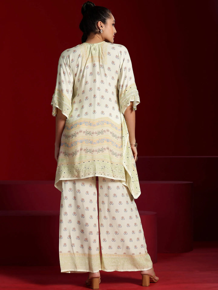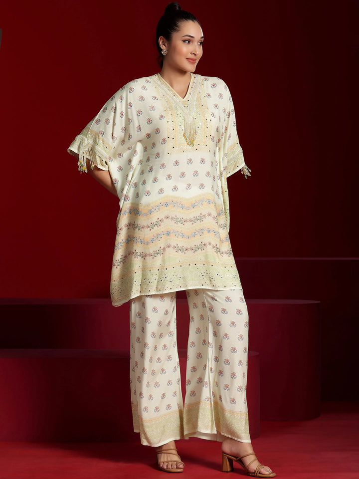 Our 2-piece Off White printed Muslin co-ord set features an Asymmetric Hemline Tunic with a V-Neck neckline and Three-quarter sleeves. Complemented with matching Palazzos with an Elasticated waistband. Highlighted with Printed, this style is perfect for Festive.