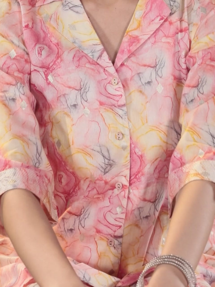 Our 2-piece pink cotton co-ord set features a button-up shirt with flared shirt sleeves and an asymmetrical hemline. Complemented with dhoti pants with a partially elasticated waistband. Elevated with handcrafted buttons, this comfortable style is perfect for casual outings.