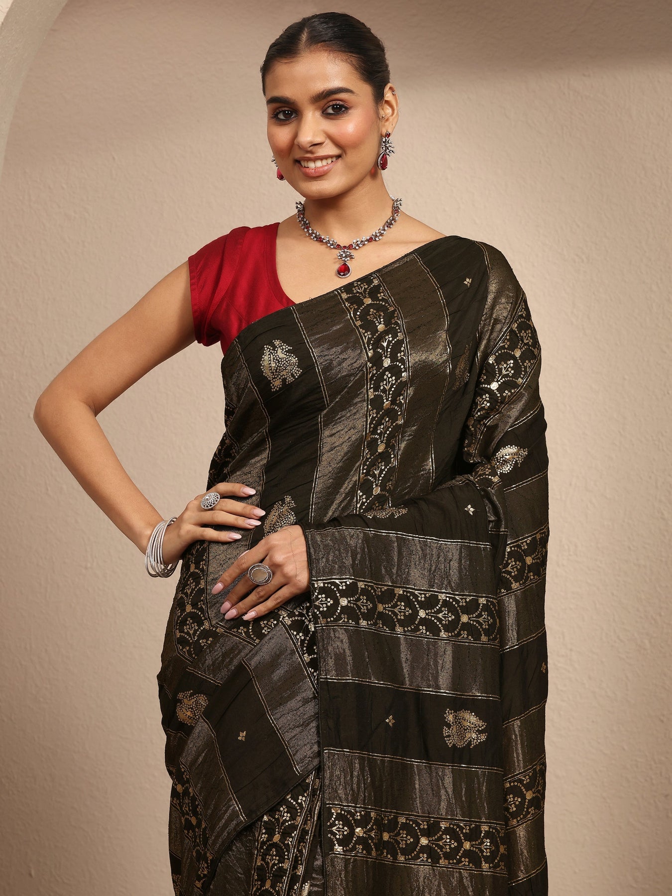 Our black printed silk blend saree features captivating embellishments. Complemented with a blouse piece. This charming saree is perfect for special occasions.