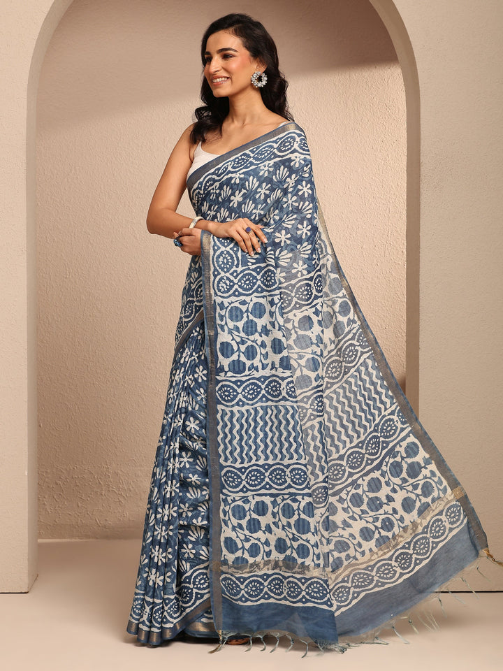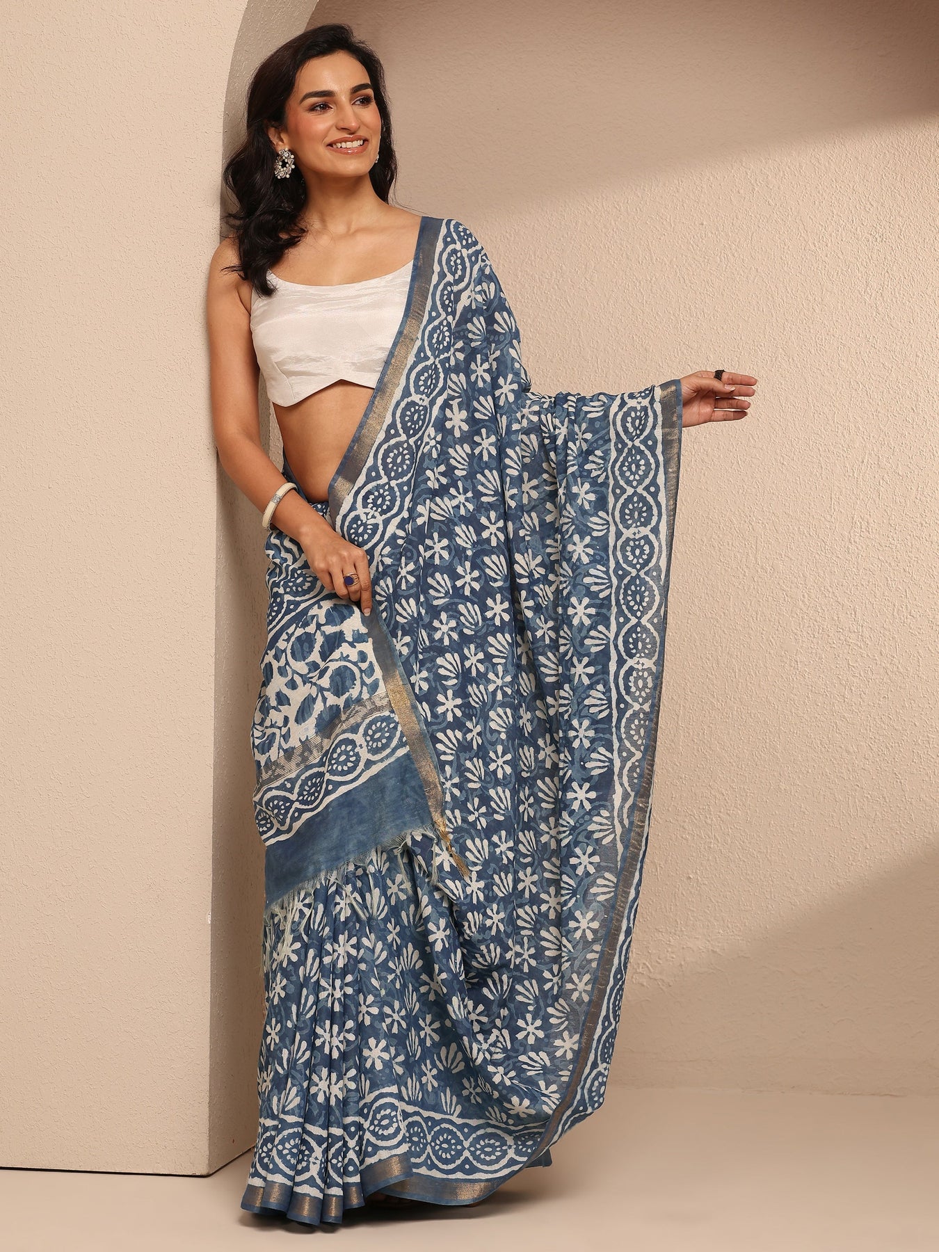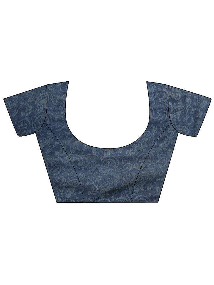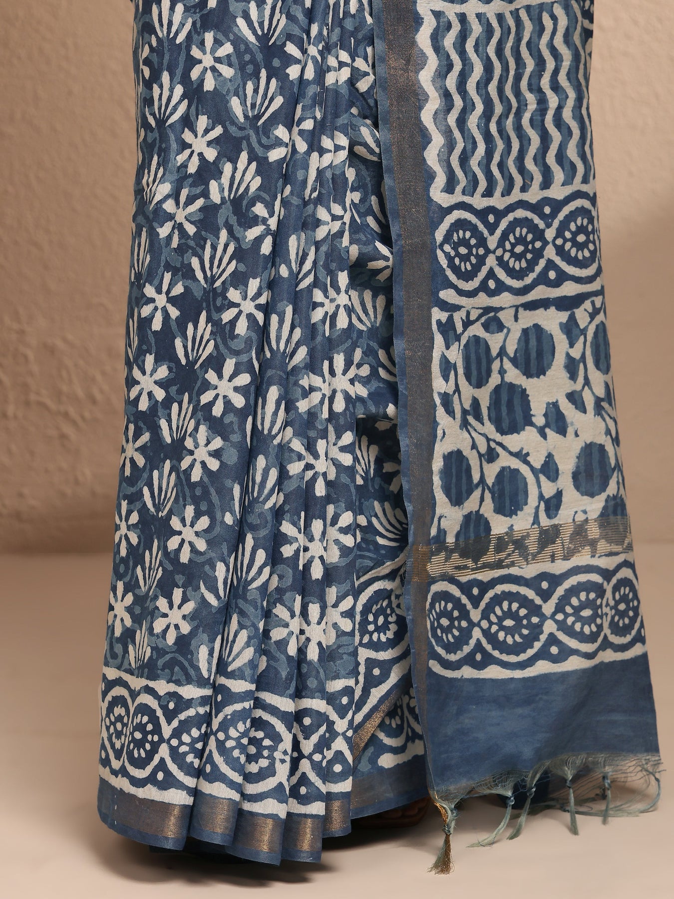 Blue Printed Cotton Saree With Unstitched Blouse Piece