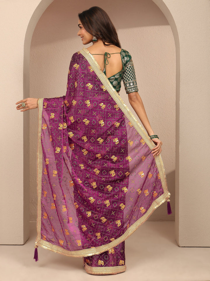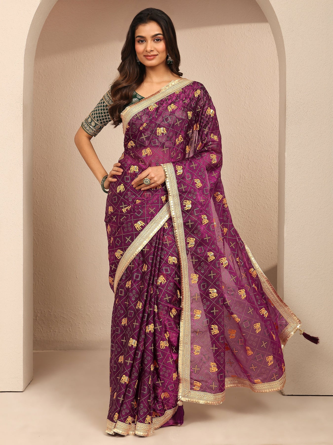 Our purple silk blend saree features captivating tribal printed. Complemented with an unstitched blouse piece. This charming saree is perfect for festive occasions.