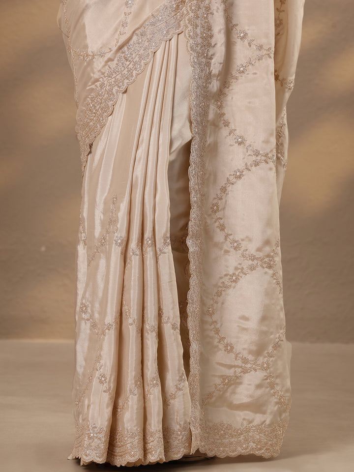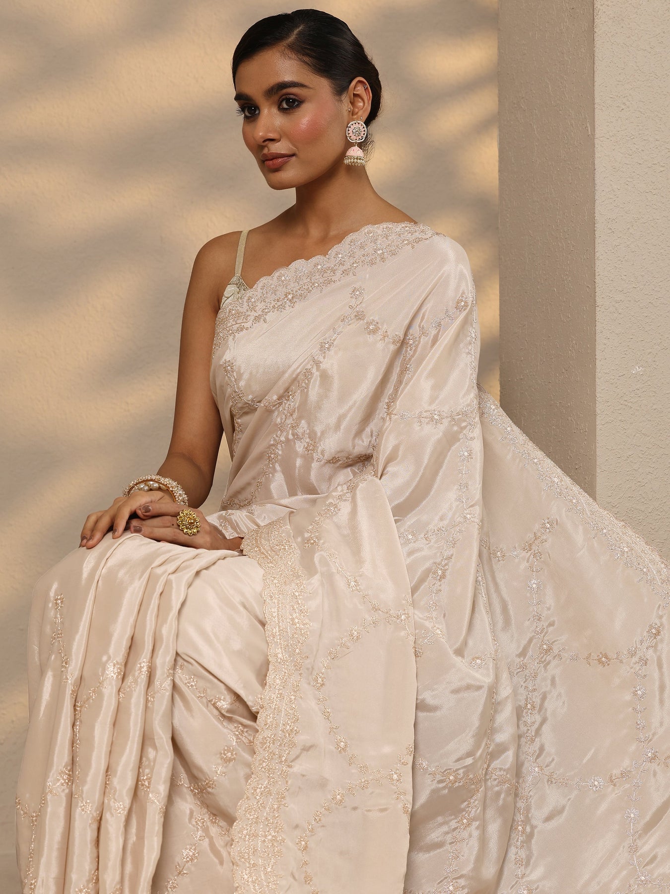 Cream Embroidered Silk Blend Saree With Unstitched Blouse Piece