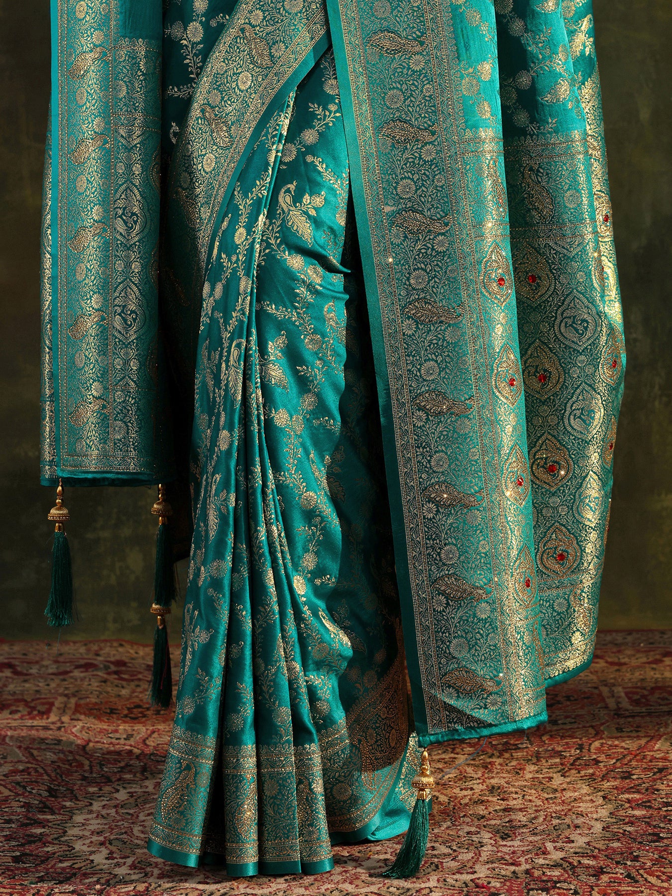 Green Banarasi Silk Saree With Unstitched Blouse And Dupatta