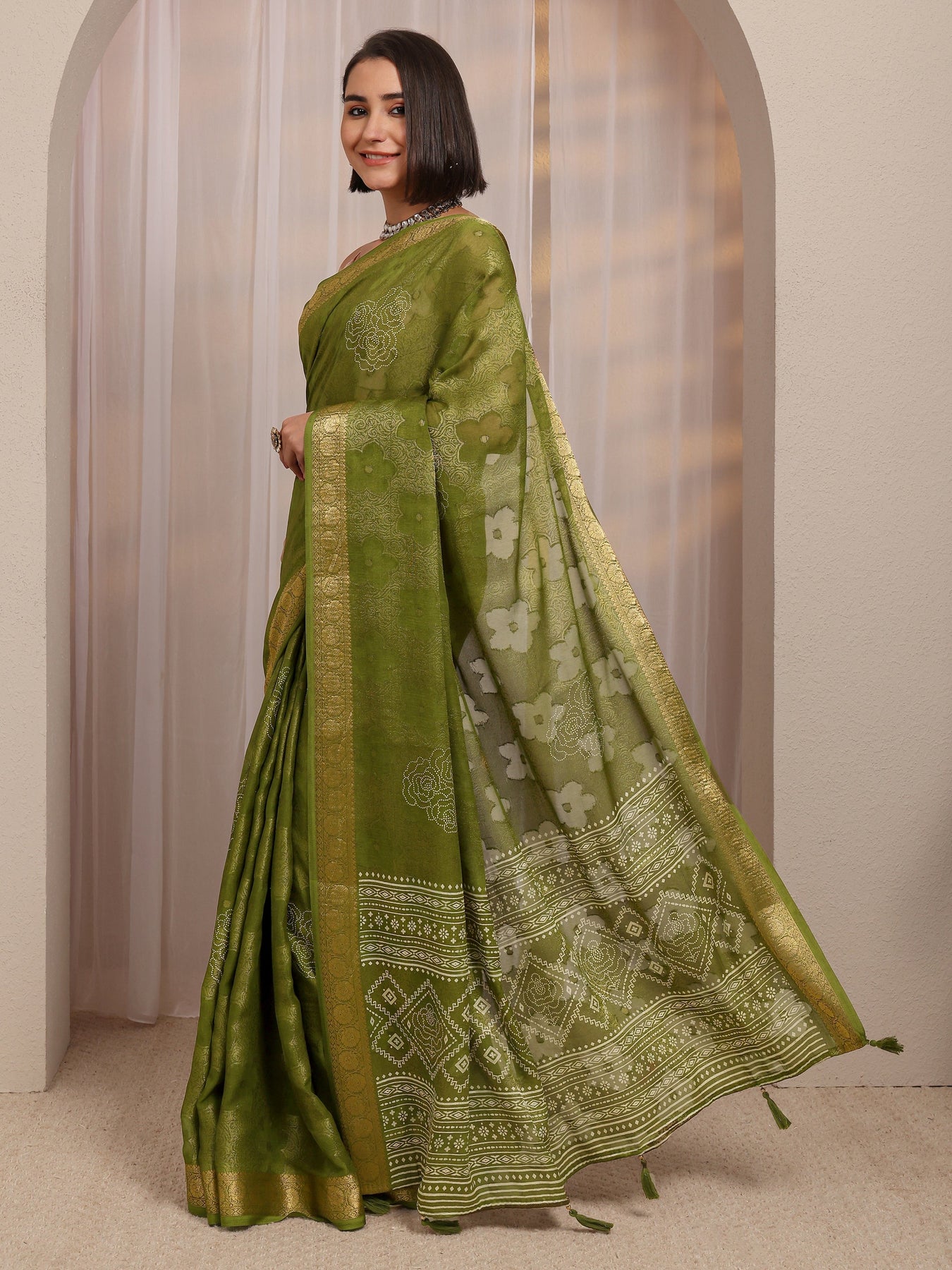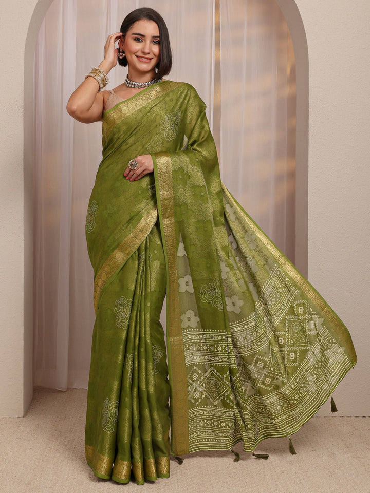 Our green printed silk blend saree features a captivating floral design inspired by traditional craftsmanship. Complemented with a Unstitched blouse piece. This charming saree is perfect for festive occasions.