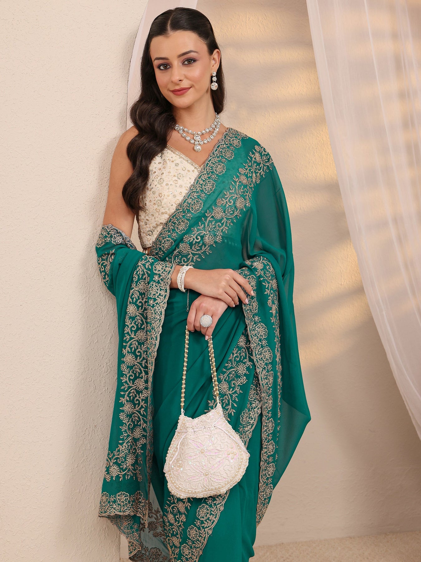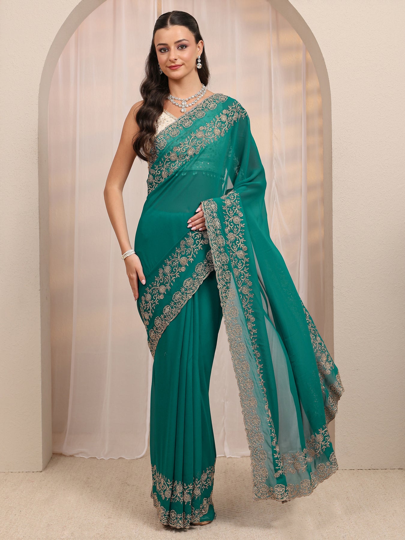 Libas Art Teal Green Embellished Silk Blend Saree With Unstitched Blouse Piece