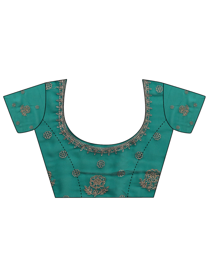 Our teal silk blend saree features a captivating embroidered design inspired by the elegance of traditional craftsmanship. Complemented with a Unstitched blouse piece. This charming saree is perfect for festive occasions.