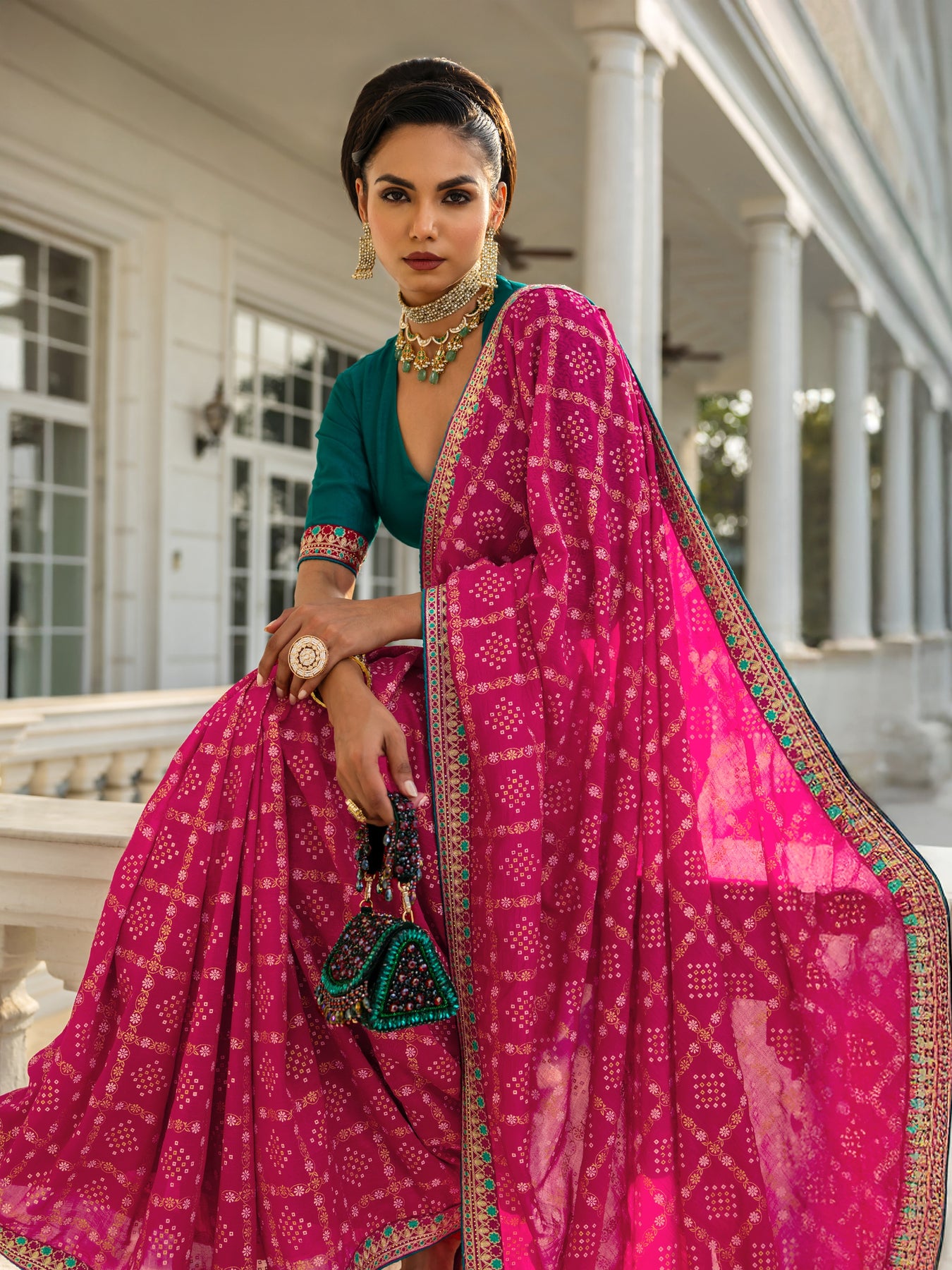 Accessorise with jhumka earrings, a fold-over clutch bag, and Kolhapuri heels to complete the look.