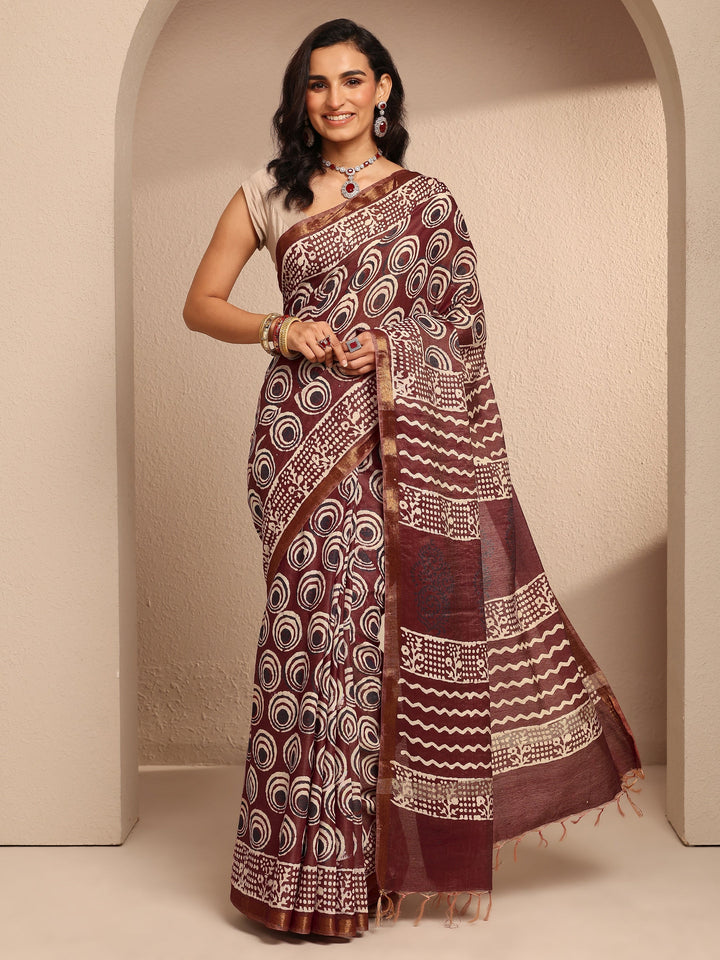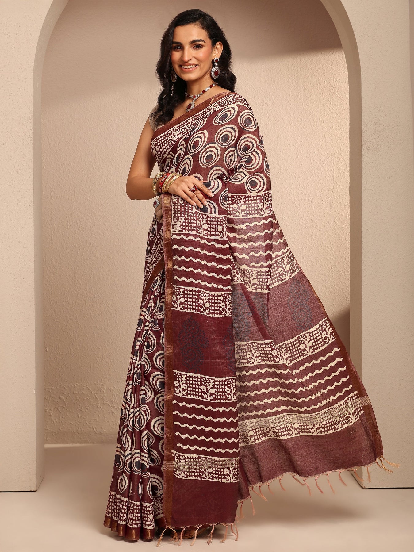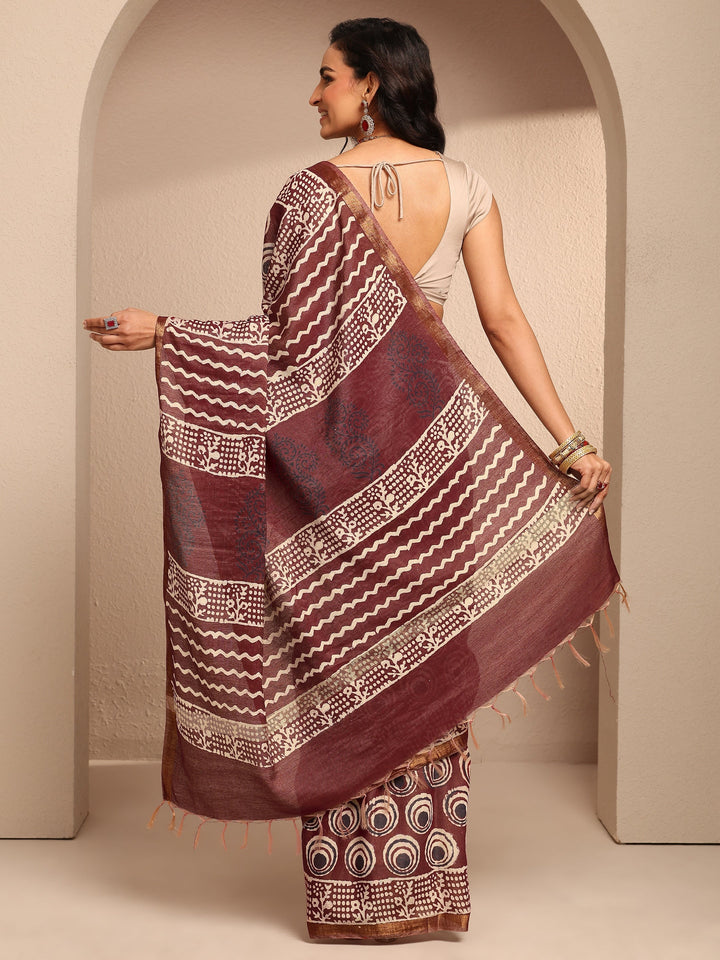Maroon Geometric Printed Cotton Saree With Unstitched Blouse Piece