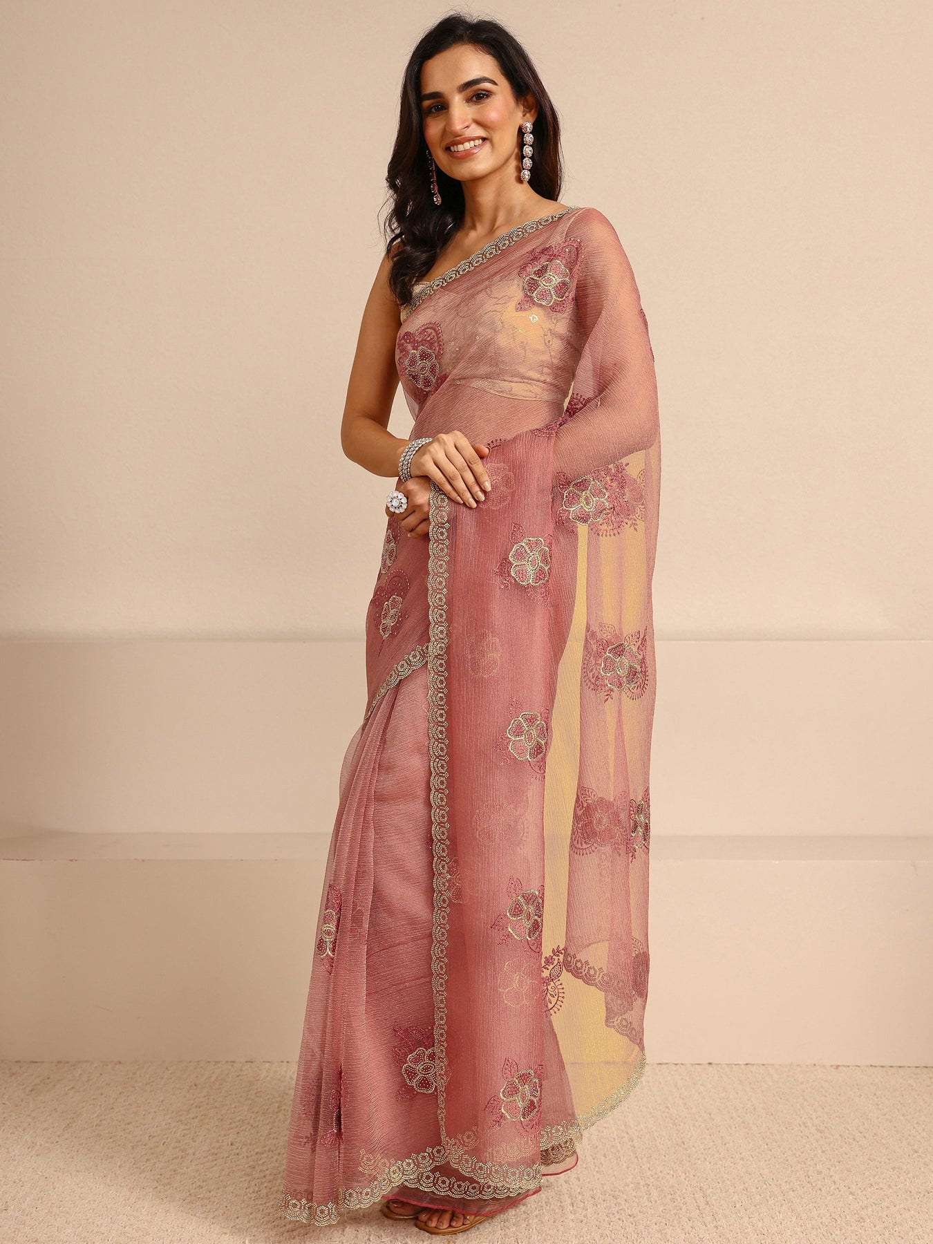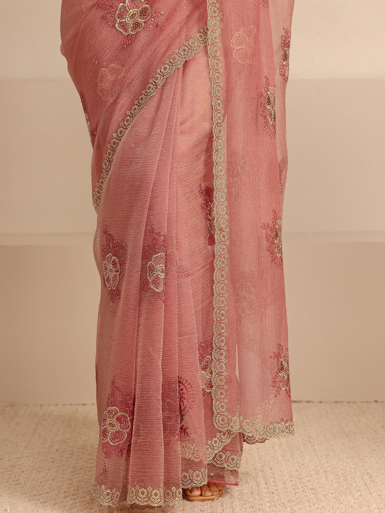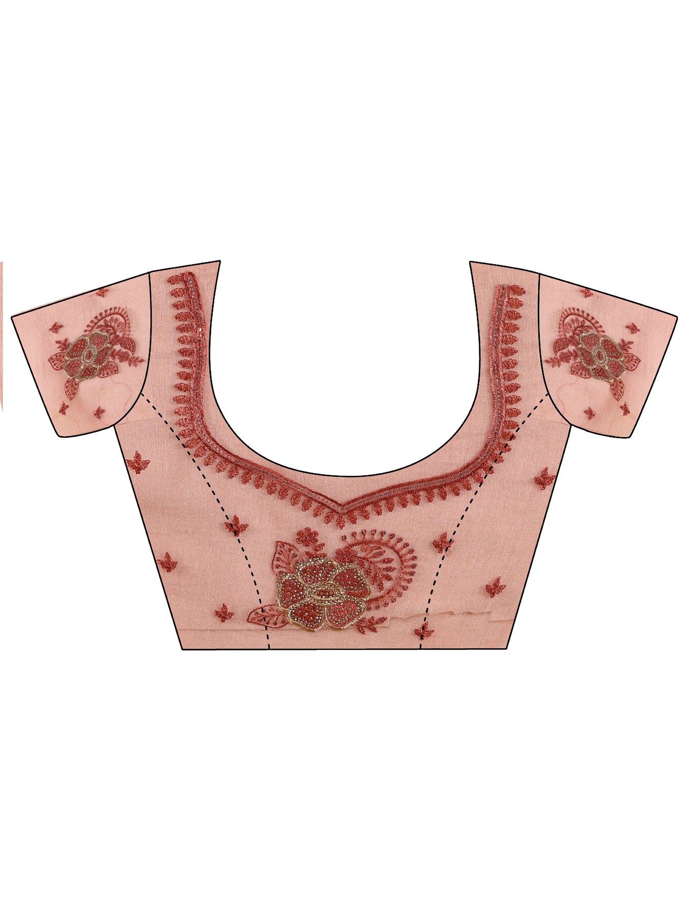 Peach Embellished Tissue Saree With Unstitched Blouse Piece
