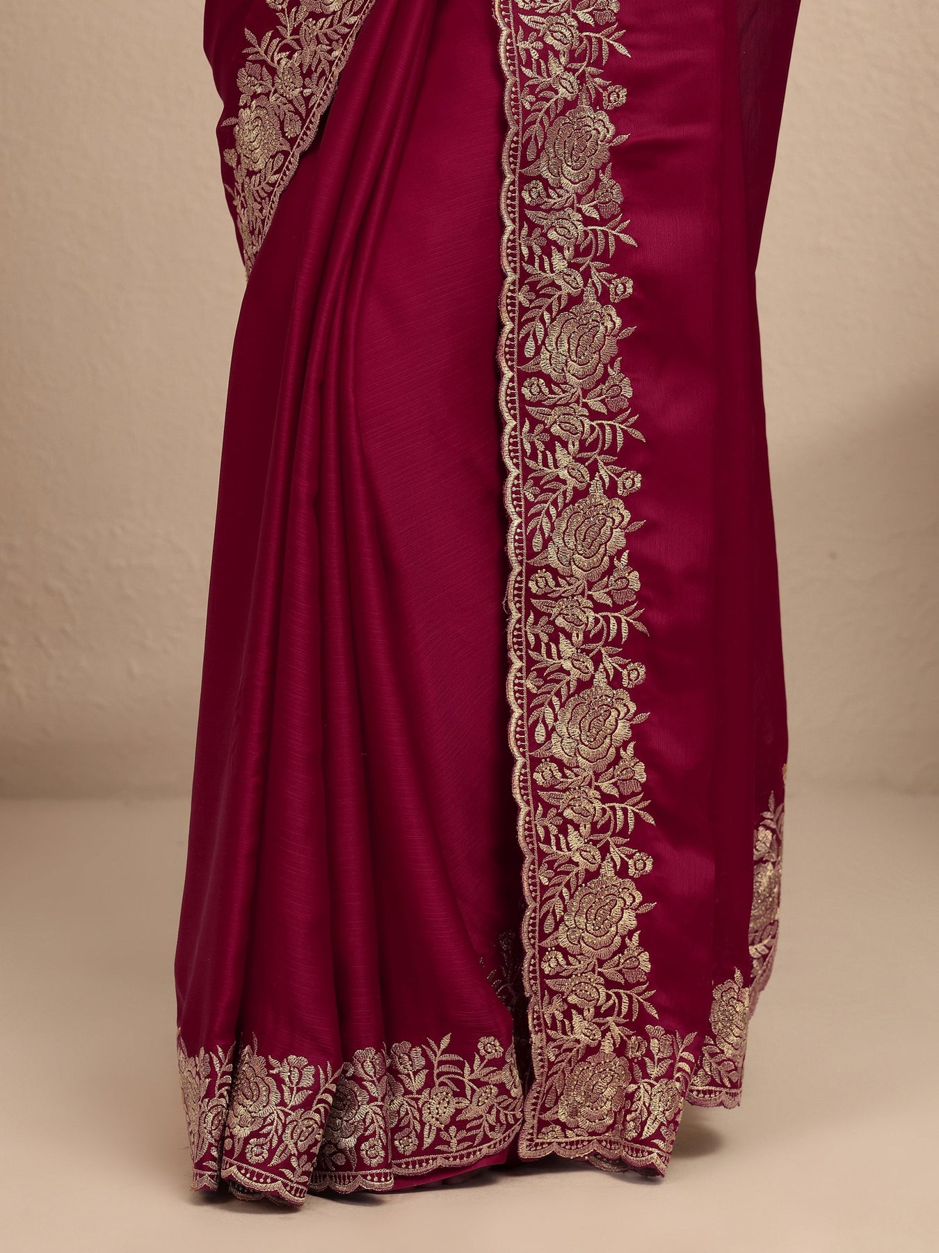 Our magenta silk blend saree features captivating solid. Complemented with an unstitched blouse piece. This charming saree is perfect for festive occasions.