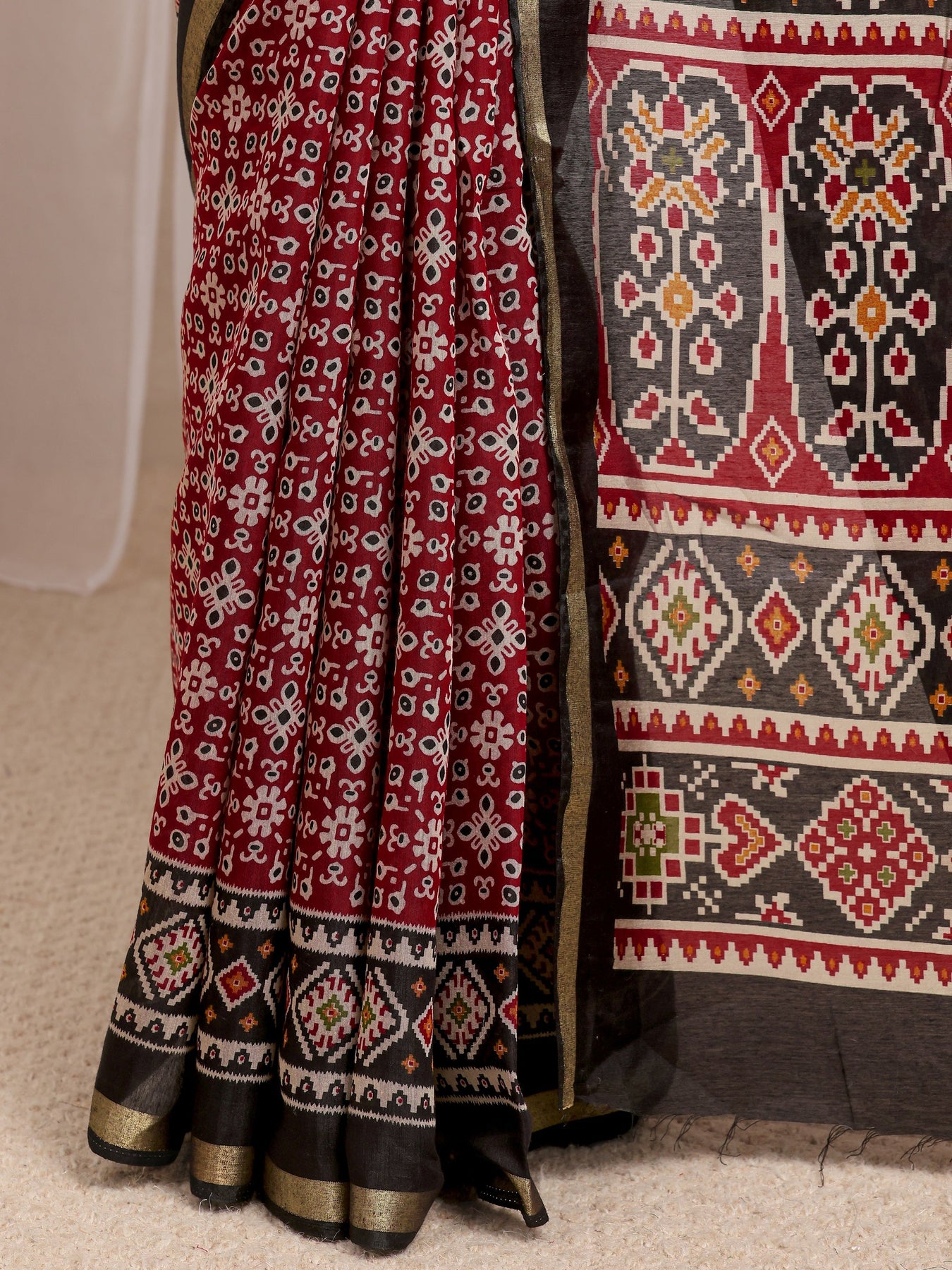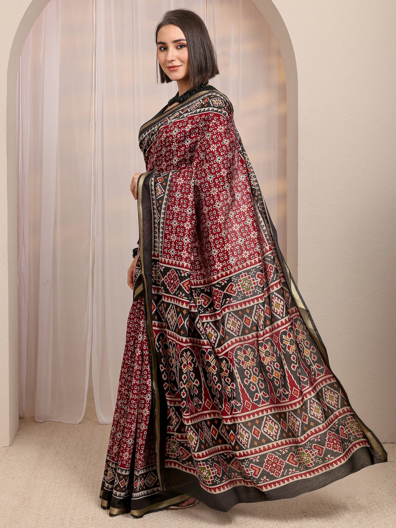 Our maroon printed silk blend saree features a captivating Ikat design inspired by the traditional Sambalpuri saree. Complemented with a Unstitched blouse piece. This charming saree is perfect for festive occasions.