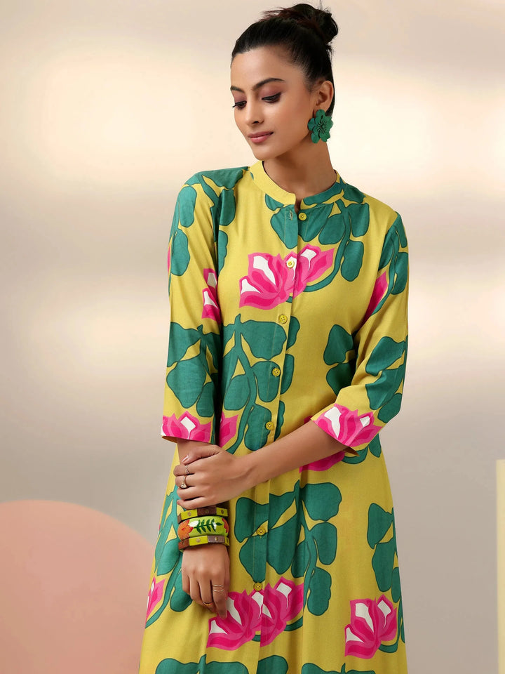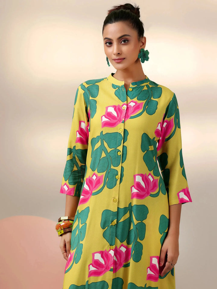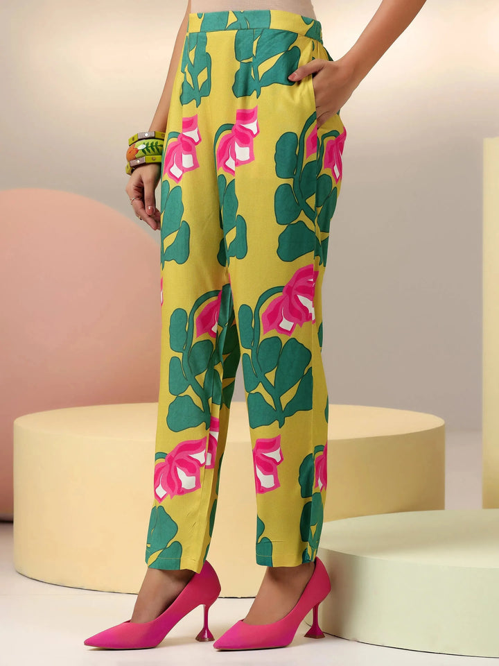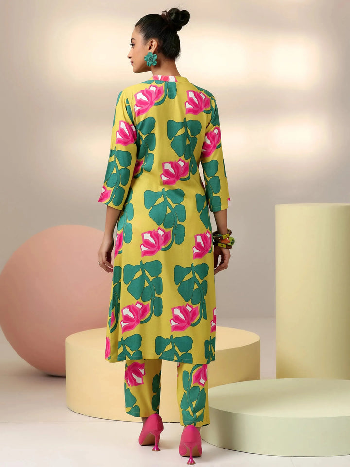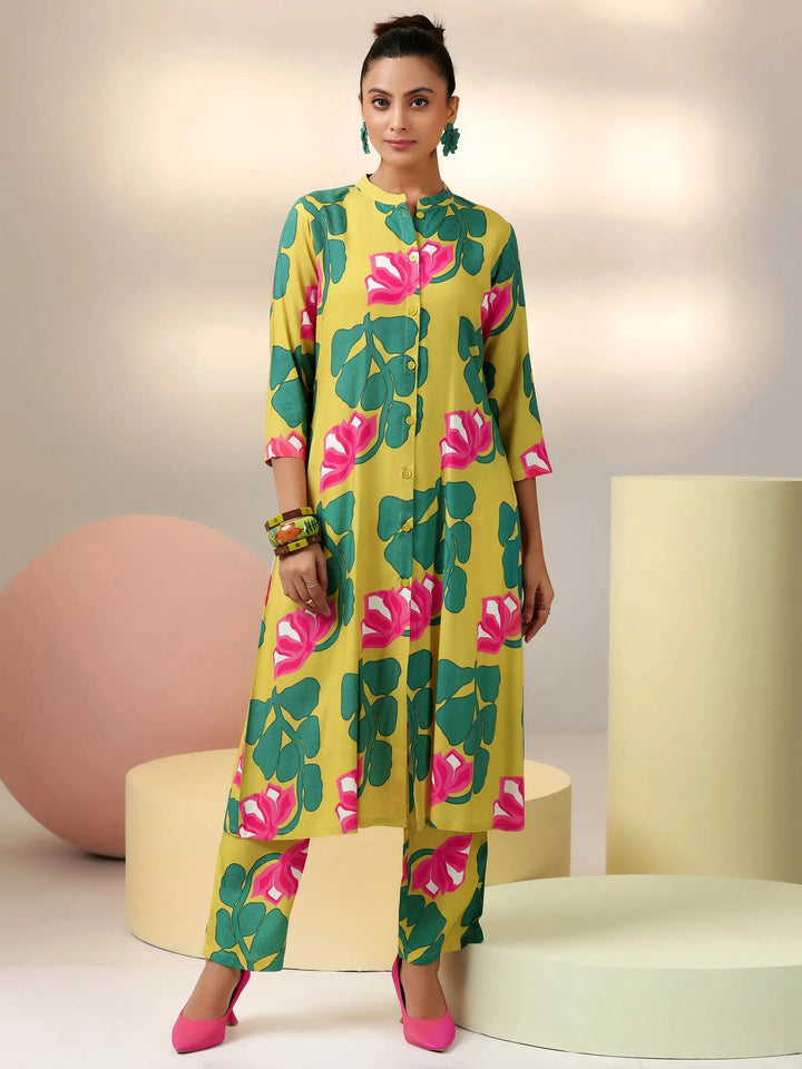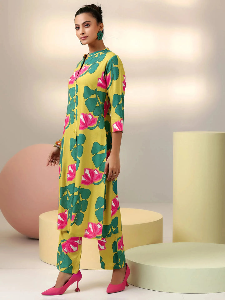 Our 2-piece Yellow printed Silk Blend co-ord set features a Straight-fit Tunic with a Mandarin Collar neckline and Three-quarter sleeves. Complemented with matching Palazzos with an Elasticated waistband and 2 pockets. Highlighted with Printed, this style is perfect for Casual.