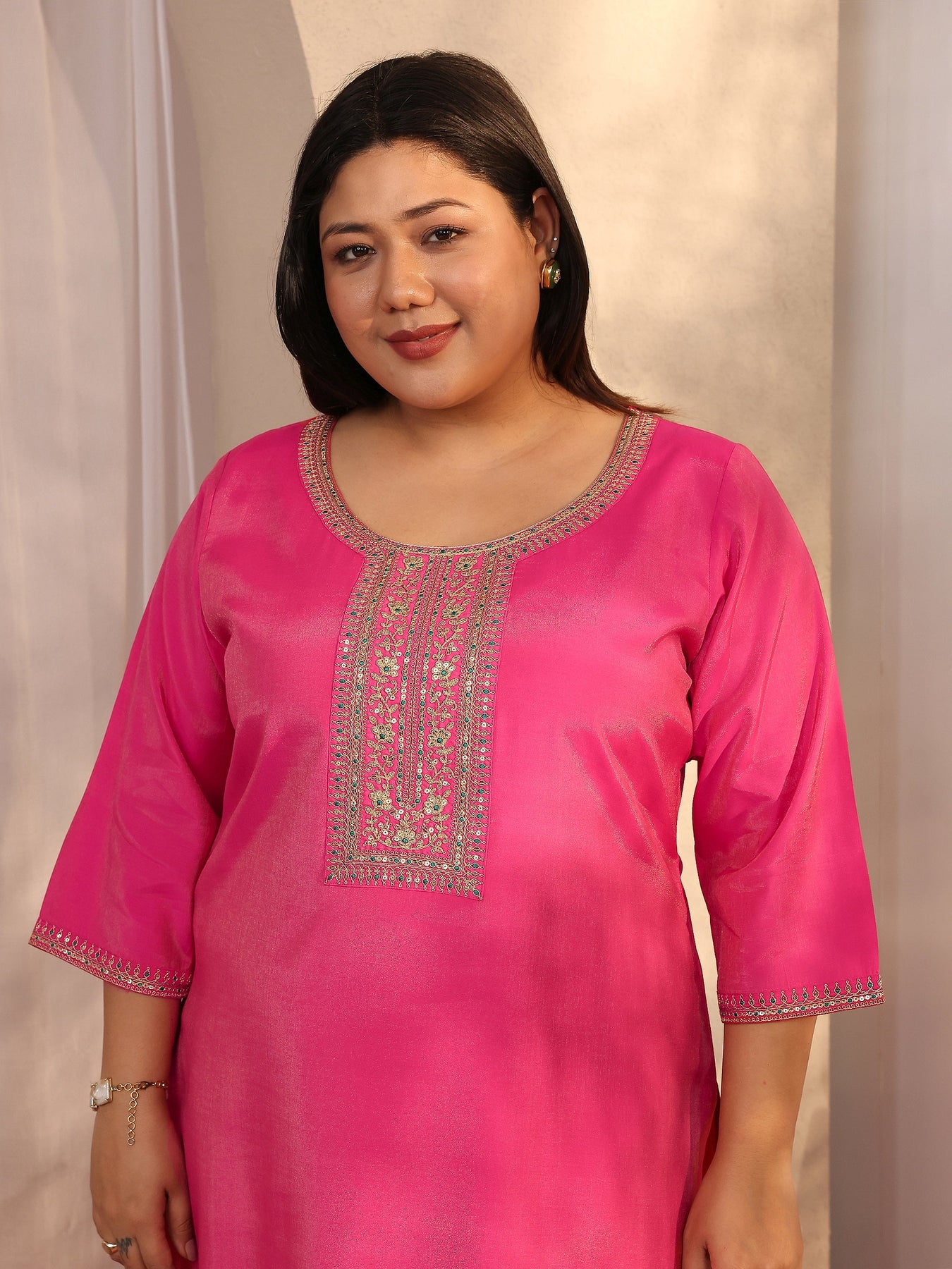 Our 3-piece pink silk blend kurta set features a straight-fit design with a round neckline, regular sleeves, and statement yoke. Complemented with straight pants with a partially elasticated waistband and a printed dupatta. Adorned with zari embellished, this style is perfect for festive occasions.
