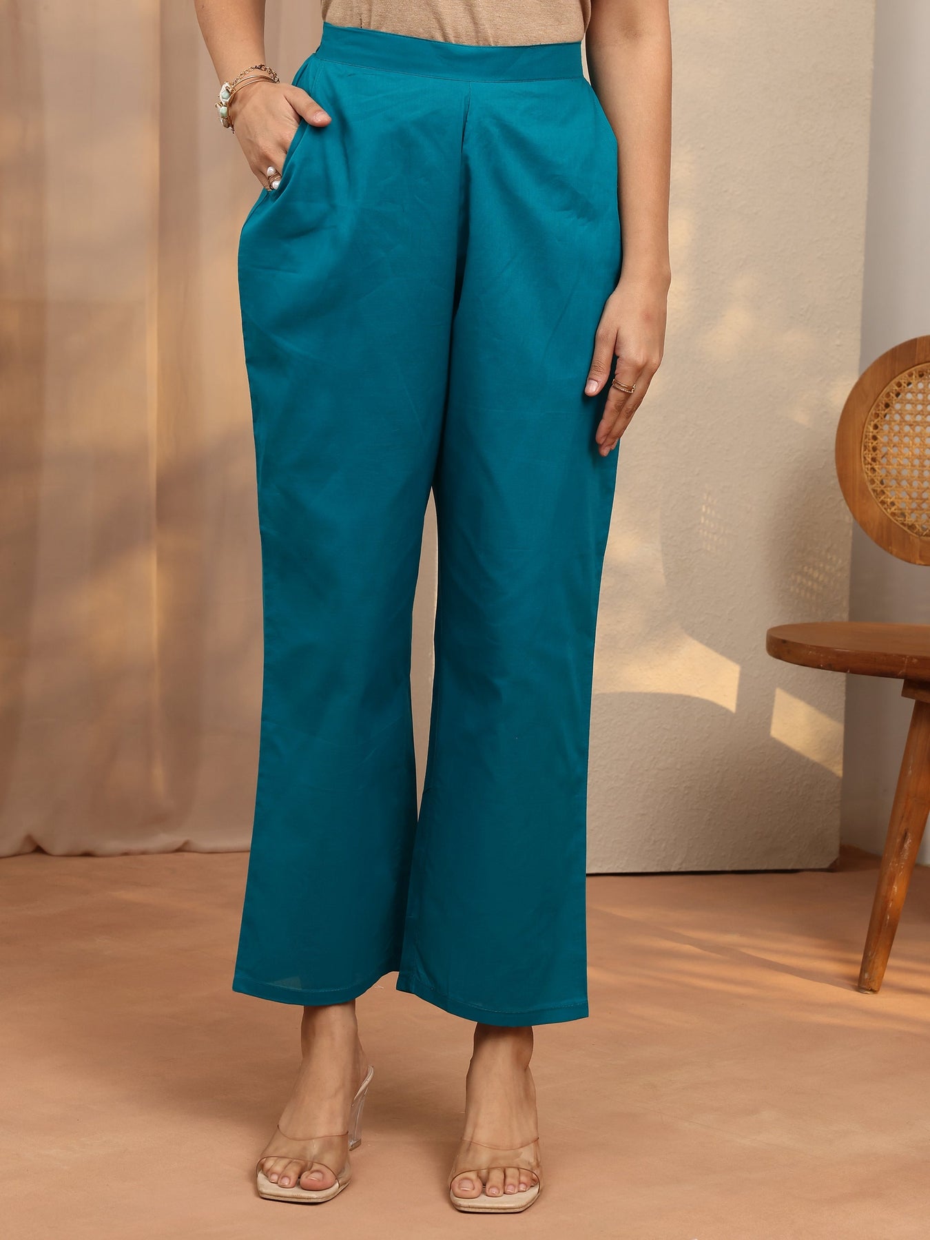 Our 3-piece teal silk blend straight-fit kurta set features a keyhole neckline, regular sleeves, and statement yoke. Complemented with straight pants with a partially elasticated waistband and 2 pockets, and an embroidered dupatta. Adorned with floral embroidered, this style is perfect for festive occasions.
