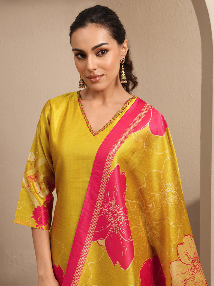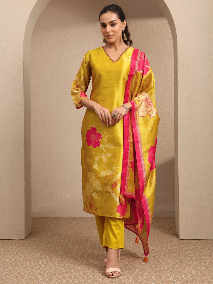 Mustard Embroidered Silk Blend Straight Suit Set With Dupatta