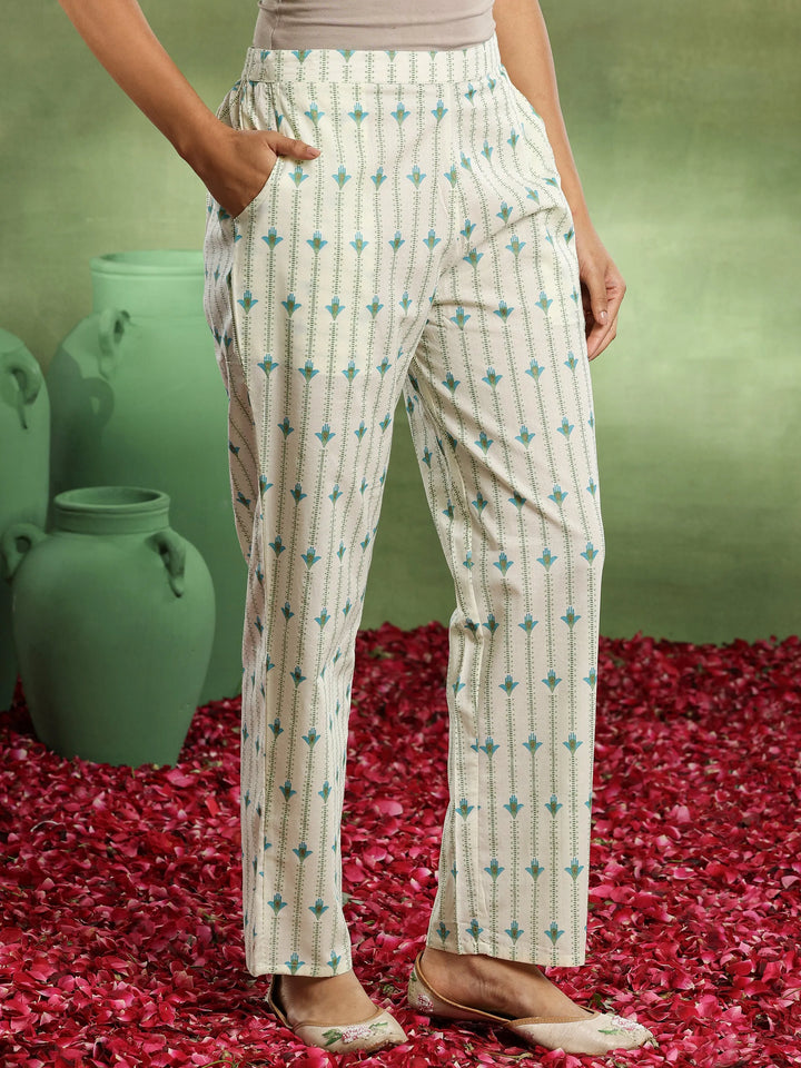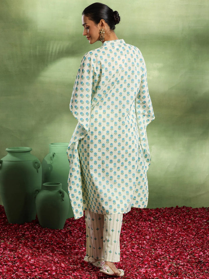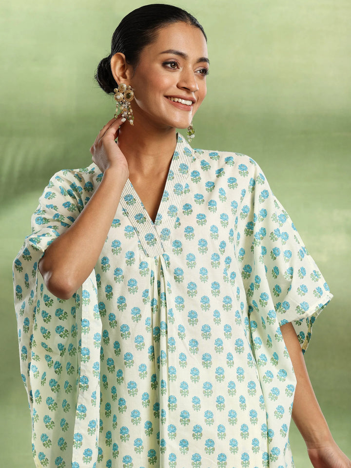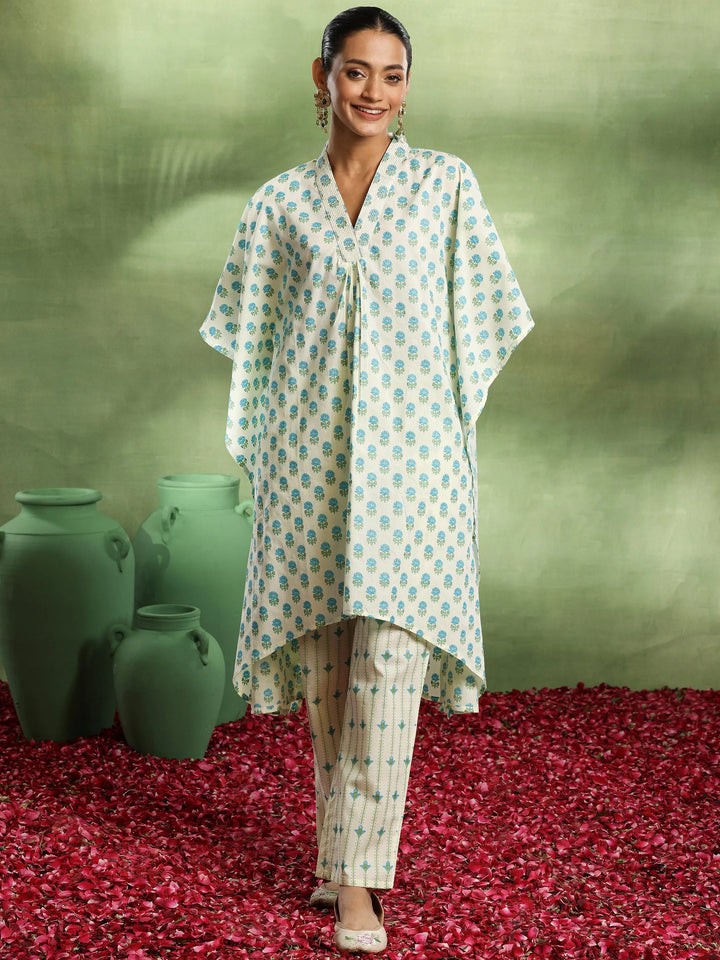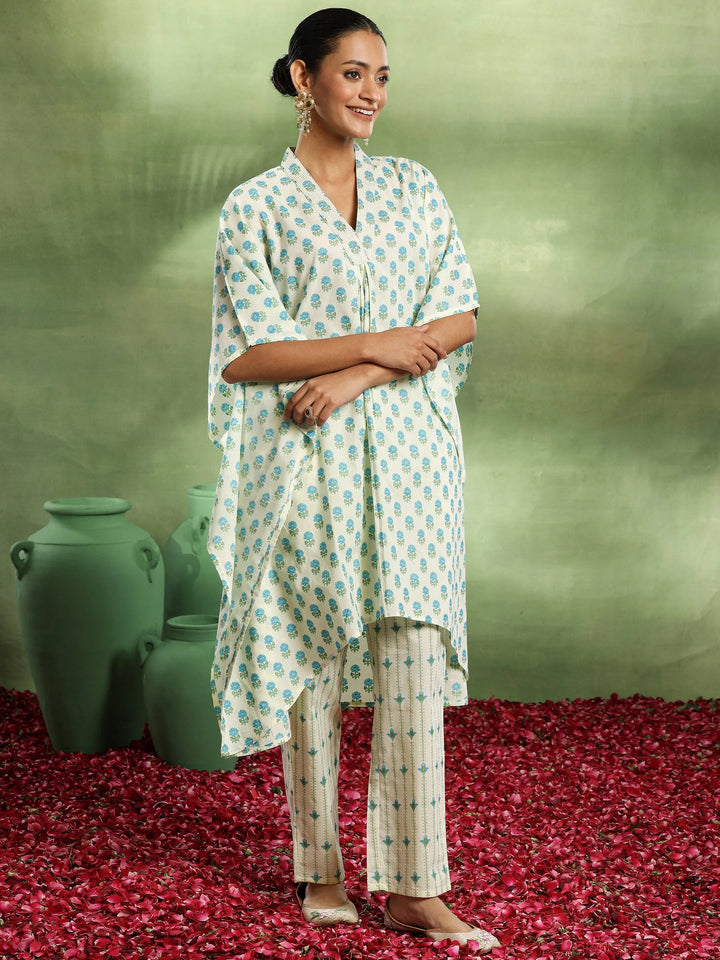 Our 2-piece cream printed pure cotton co-ord set features a kaftan kurta with a V-neckline and three-quarter sleeves. Complemented with matching trousers with a partially elasticated waistband. Adorned with captivating floral print, this style is perfect for casual outings.