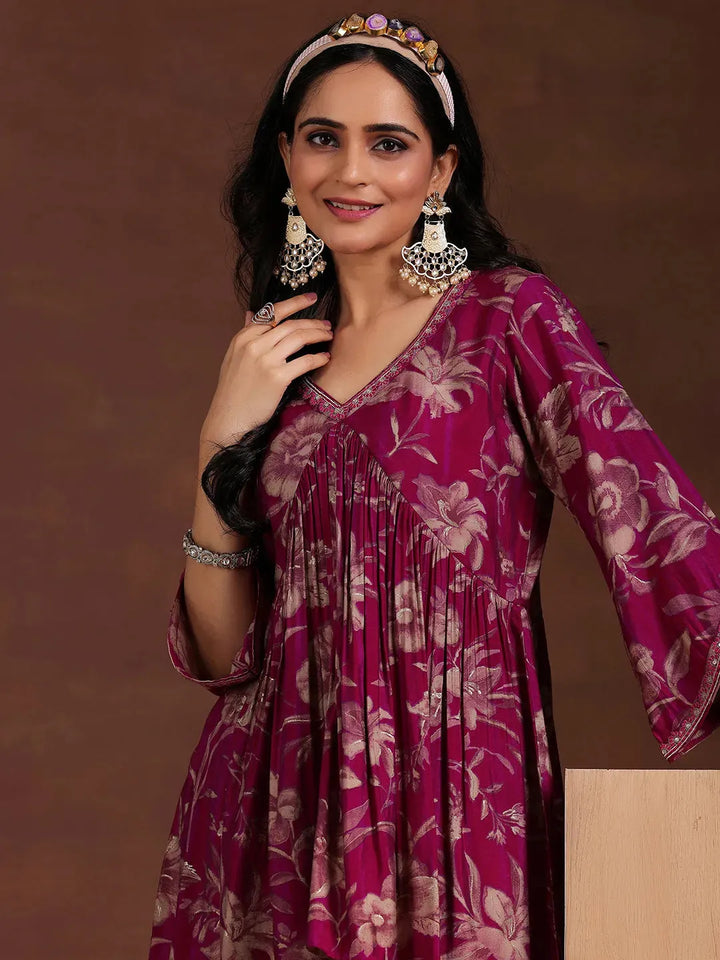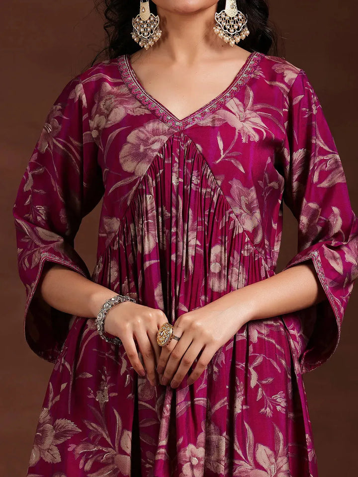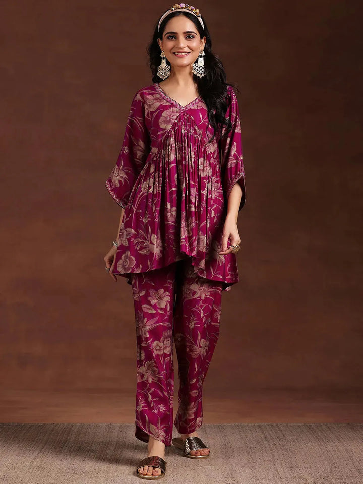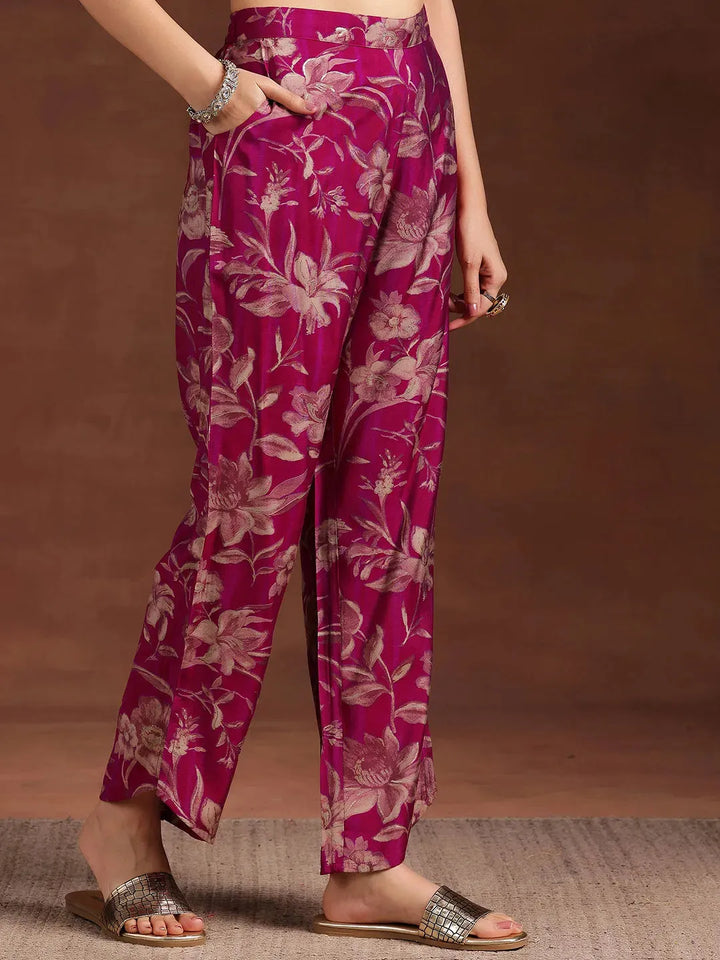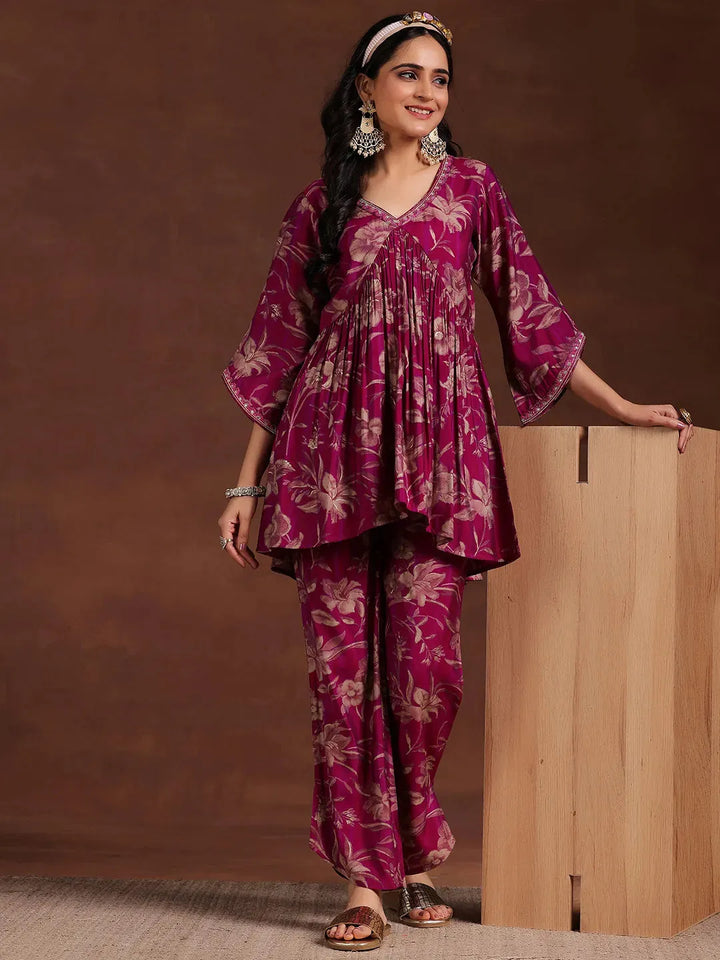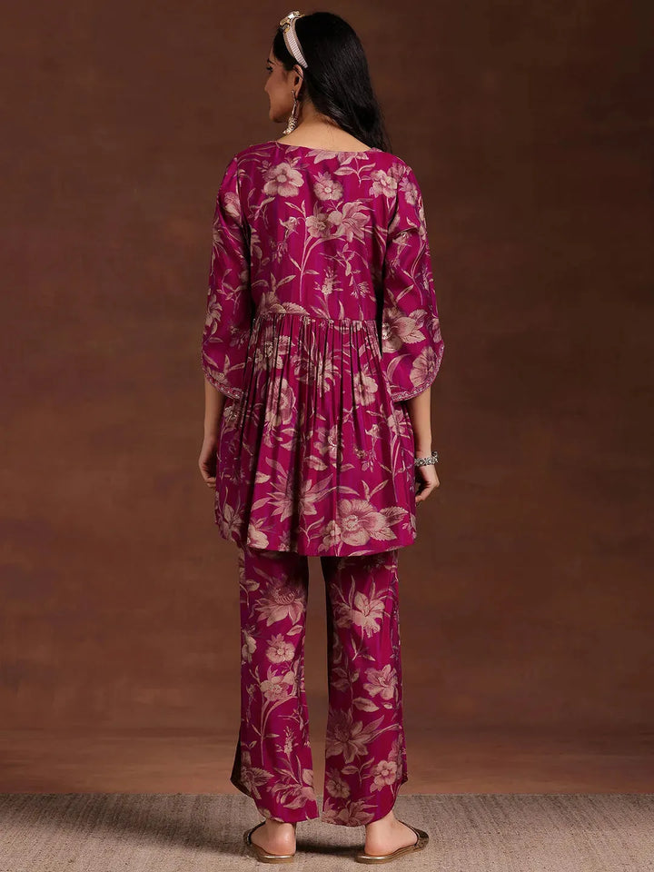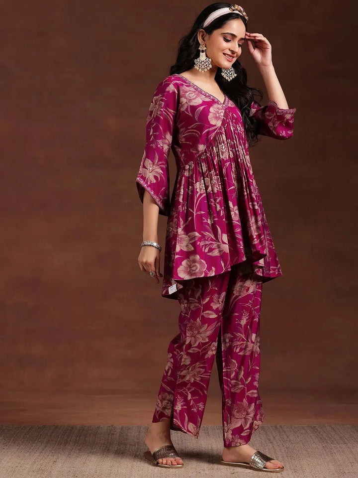 Our 2-piece pink printed silk blend co-ord set features an A-line short kurta with a V-neckline and three-quarter sleeves. Complemented with trousers with a partially elasticated waistband and roomy pockets. Highlighted with sequins, thread work, and captivating floral prints, this style is perfect for casual outings.