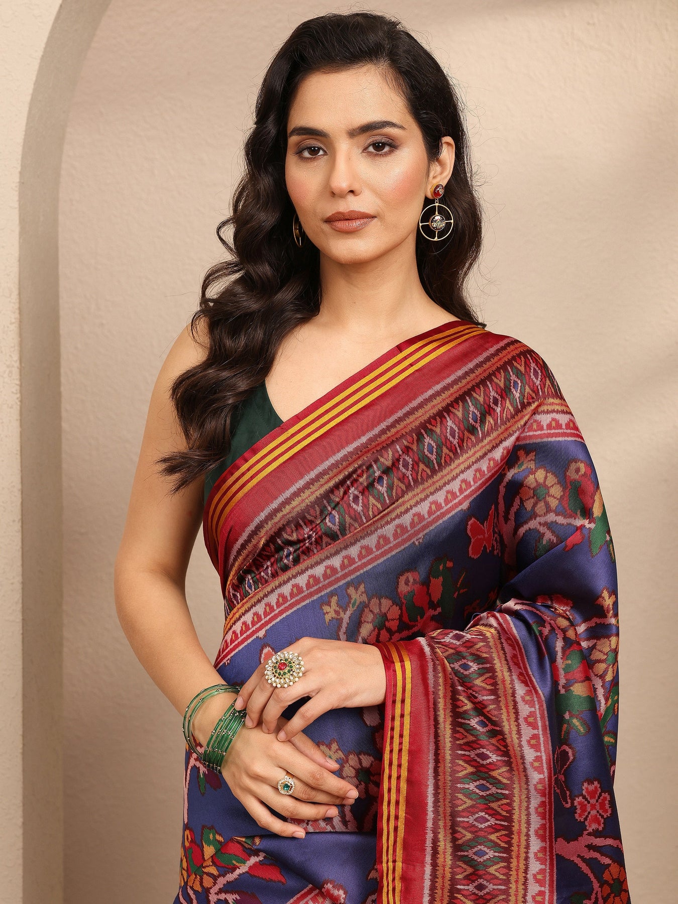 Our Navy Blue printed Silk blend saree features captivating floral print. Complemented with a Unstitched blouse piece.. This charming saree is perfect for festive occasions.