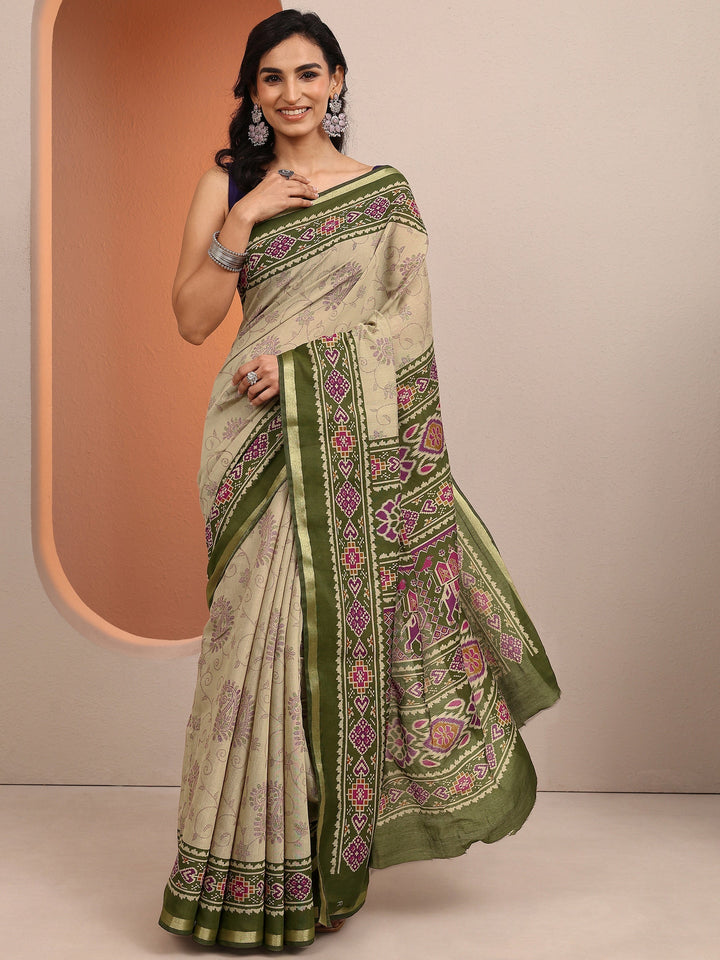 Beige Paisley Printed Silk Blend Saree With Unstitched Blouse Piece