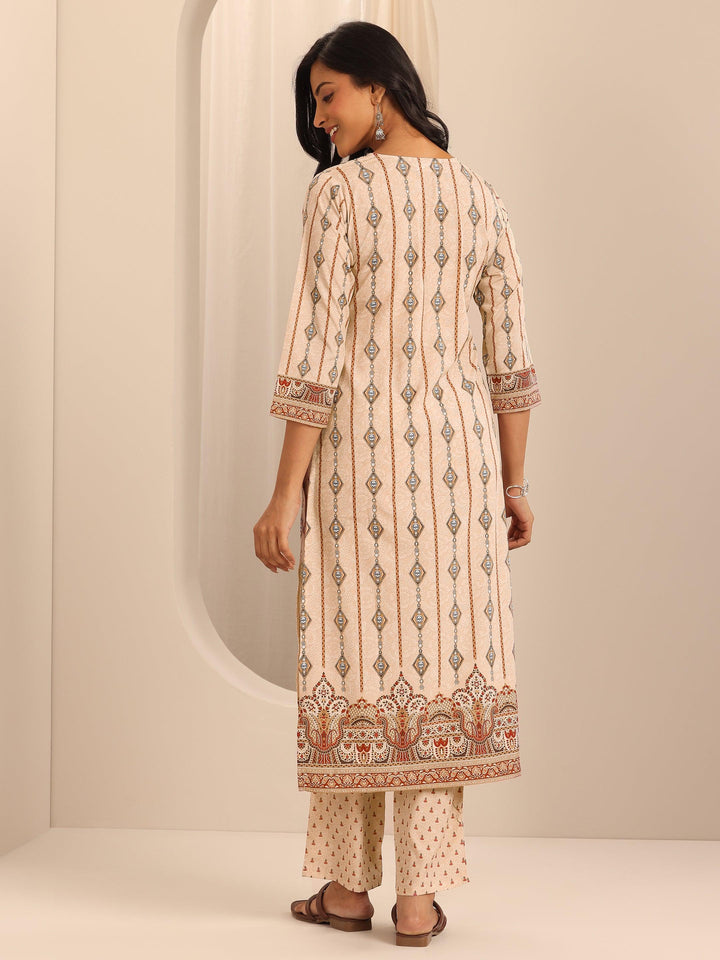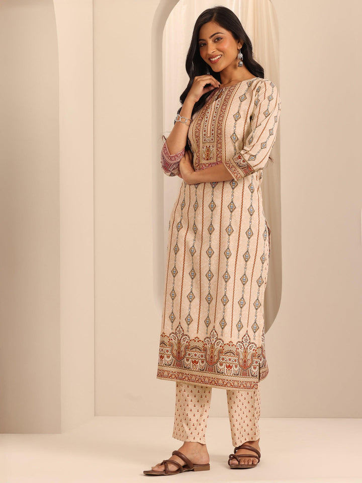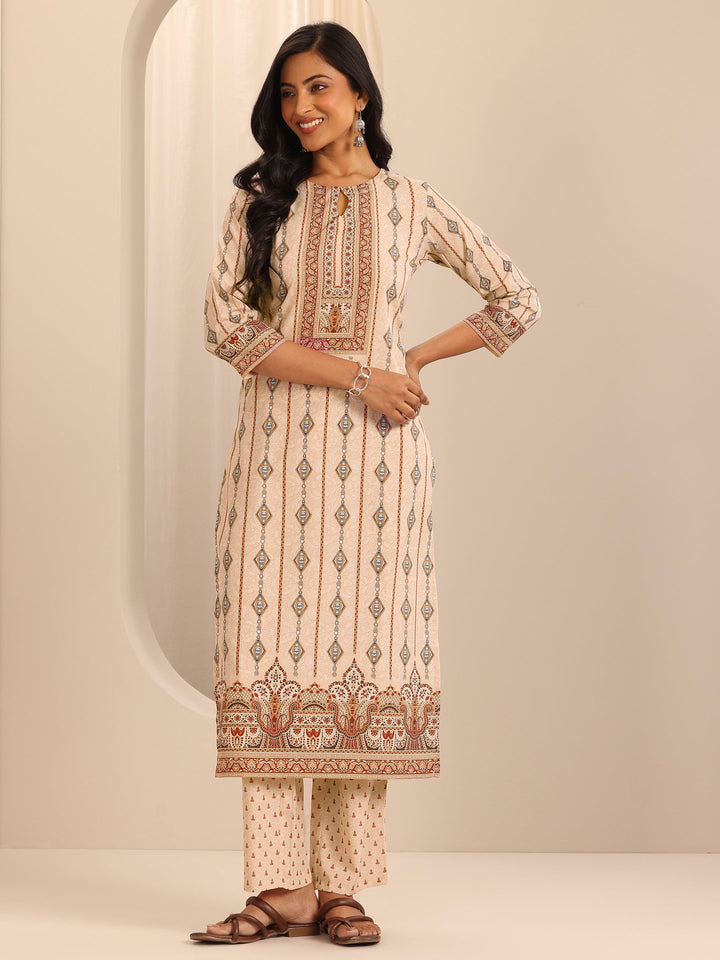 Our 2-piece beige printed crepe kurta set features a straight-fit kurta with a keyhole neckline and three-quarter sleeves. Complemented with trousers with a partially elasticated waistband and roomy pockets. Elevated with captivating ethnic motifs prints, this style is perfect for casual outings.