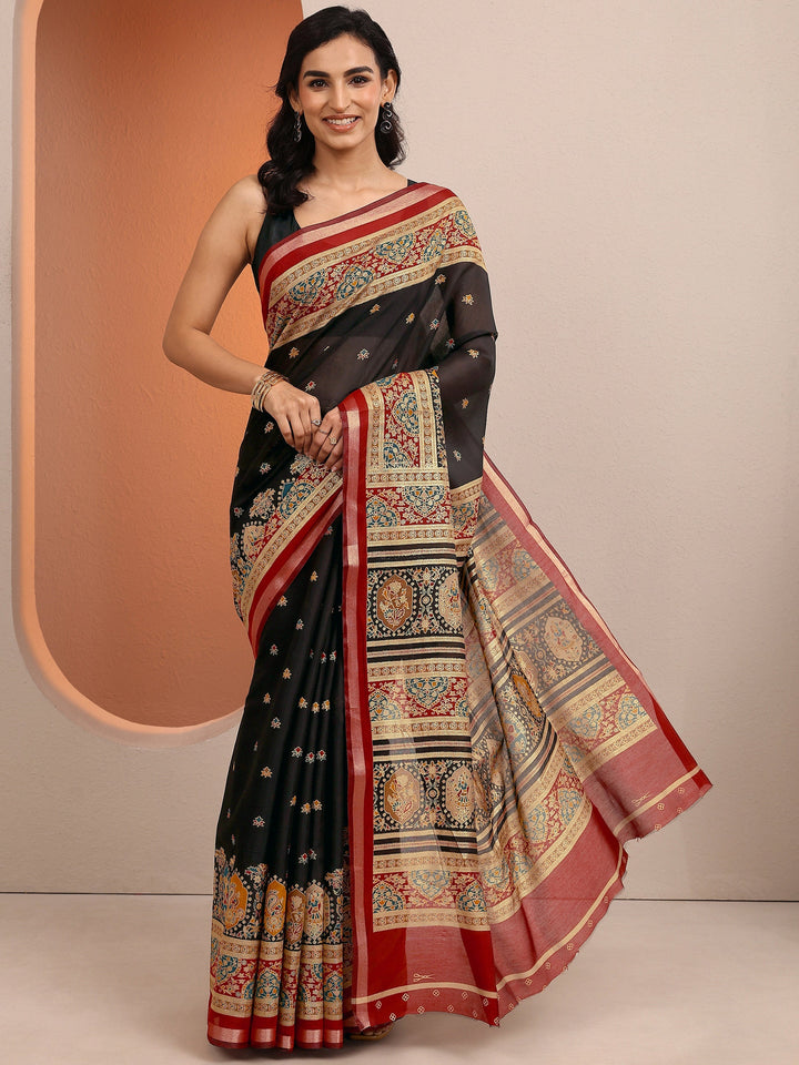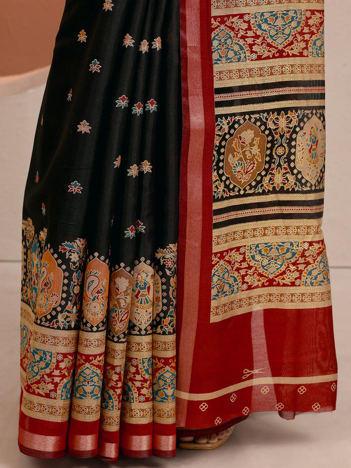 Black Printed Silk Blend Saree With Unstitched Blouse Piece