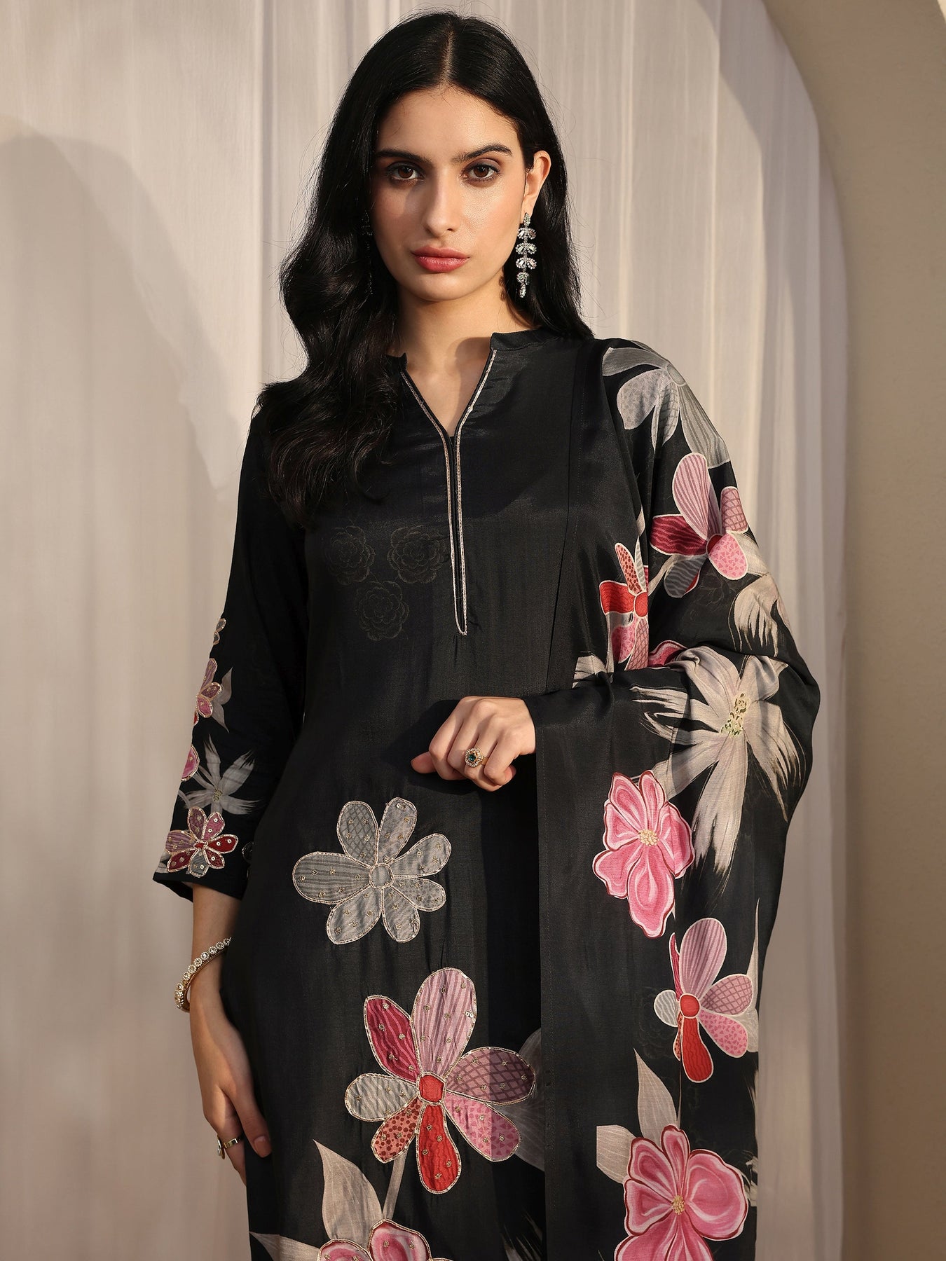 Black Printed Silk blend Straight Suit Set With Dupatta
