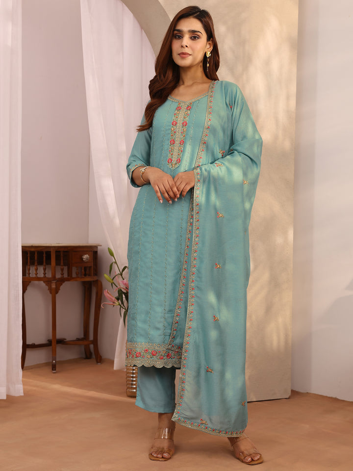Blue Embroidered Silk Blend Straight Suit Set With Dupatta