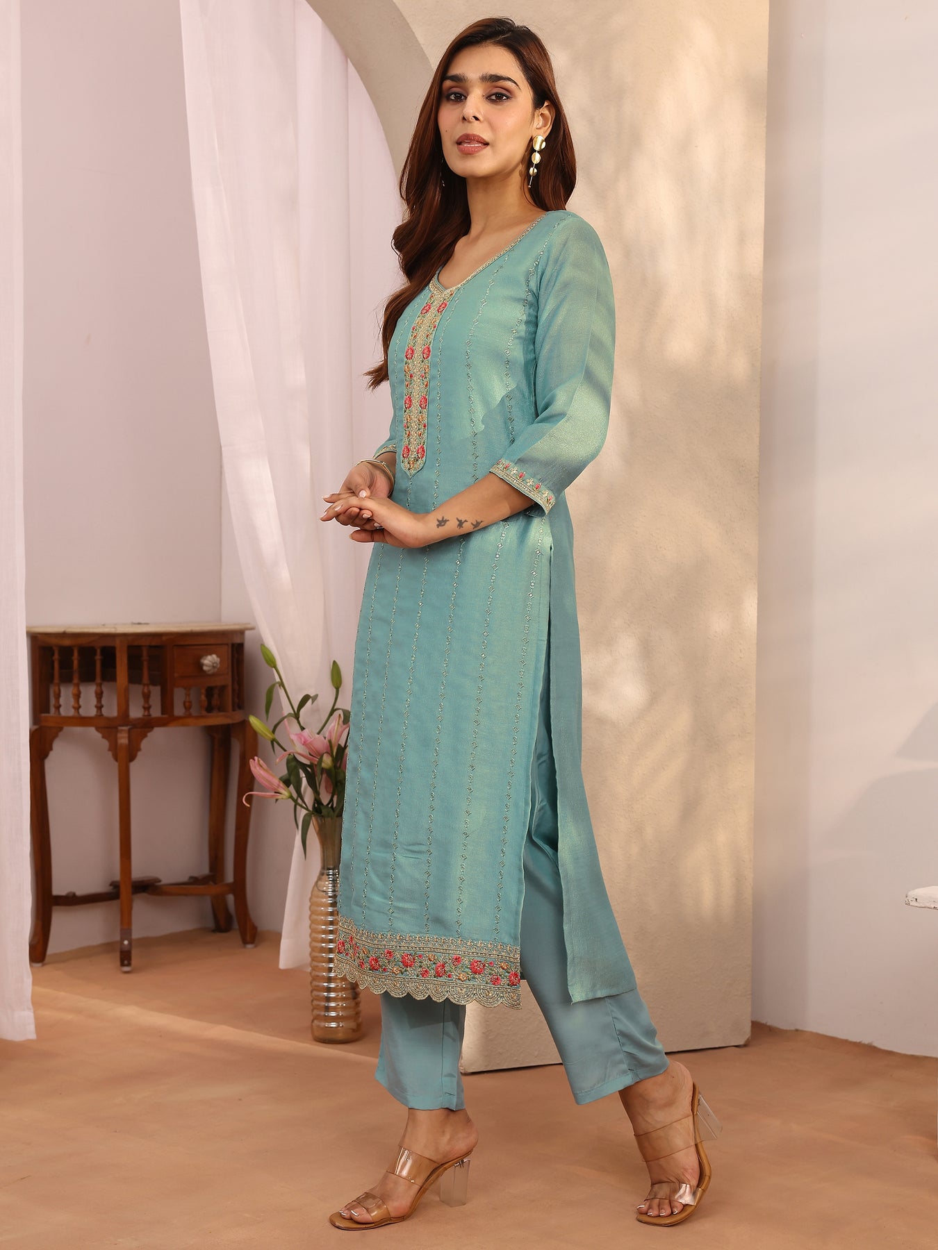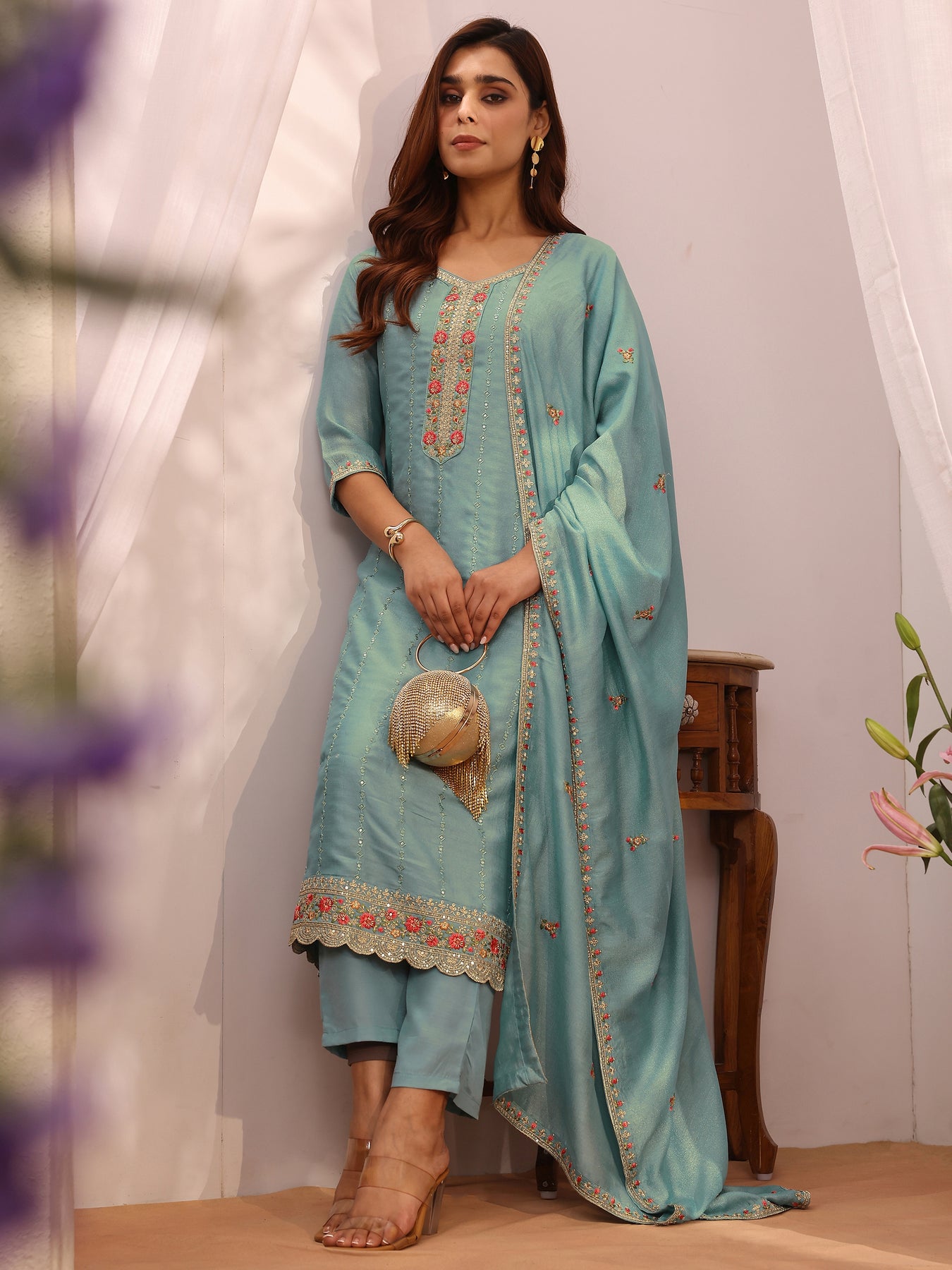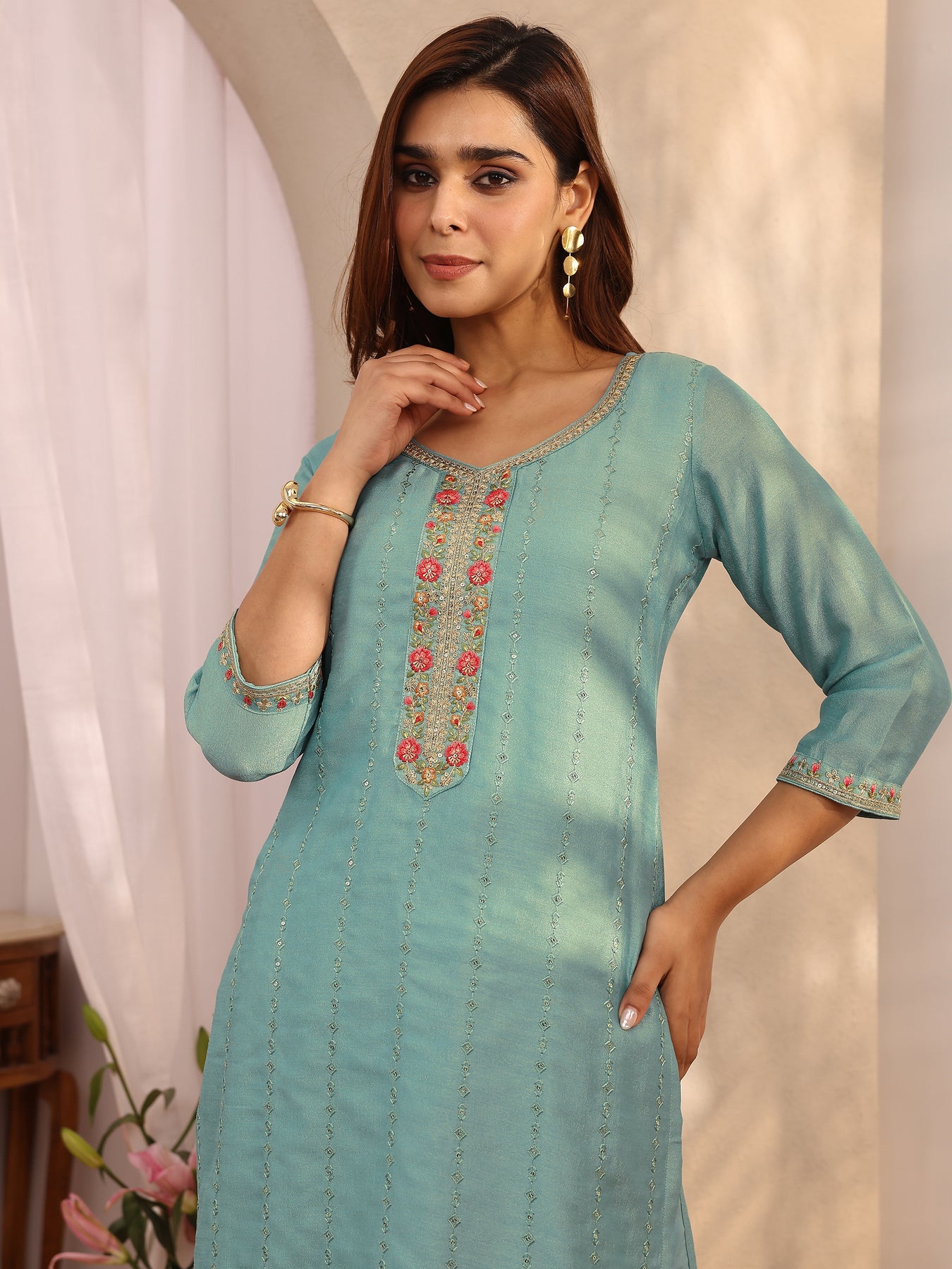 Our 3-piece sea green silk blend straight-fit kurta set features a round neckline, comfortable full sleeves, and statement yoke. Complemented with straight pants with a partially elasticated waistband and 2 pockets, and an embroidered dupatta. Adorned with floral embroidered, this style is perfect for festive occasions.