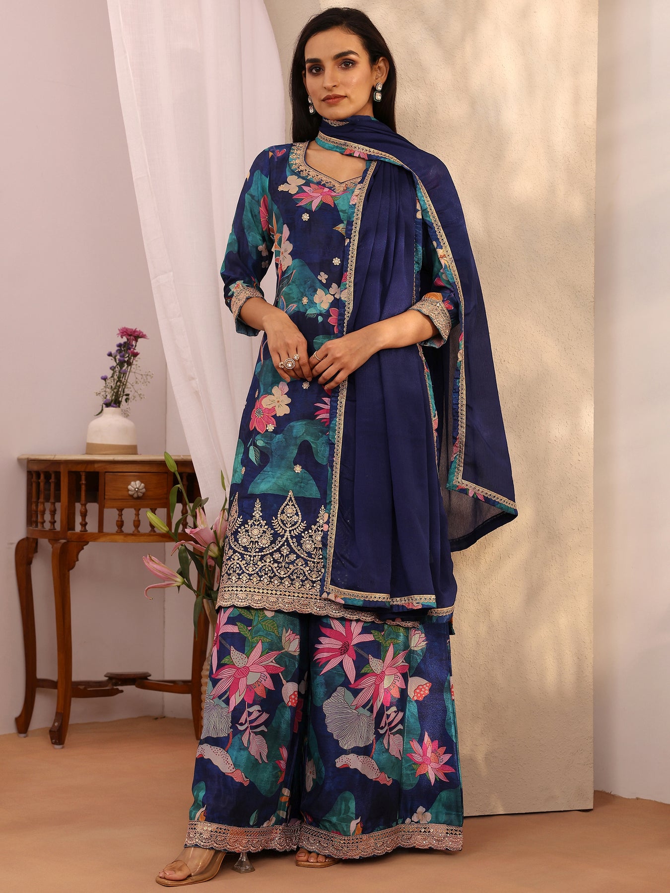 Our 3-piece Navy Blue Chinon Kurta Set features a Straight-fit kurta with a Round Neckline, Regular Sleeves, and statement yoke. Complemented with Flared Palazzo Pants with a Partially Elasticated waistband and a Solid dupatta. Adorned with floral printed, this style is perfect for Dark Festive occasions.