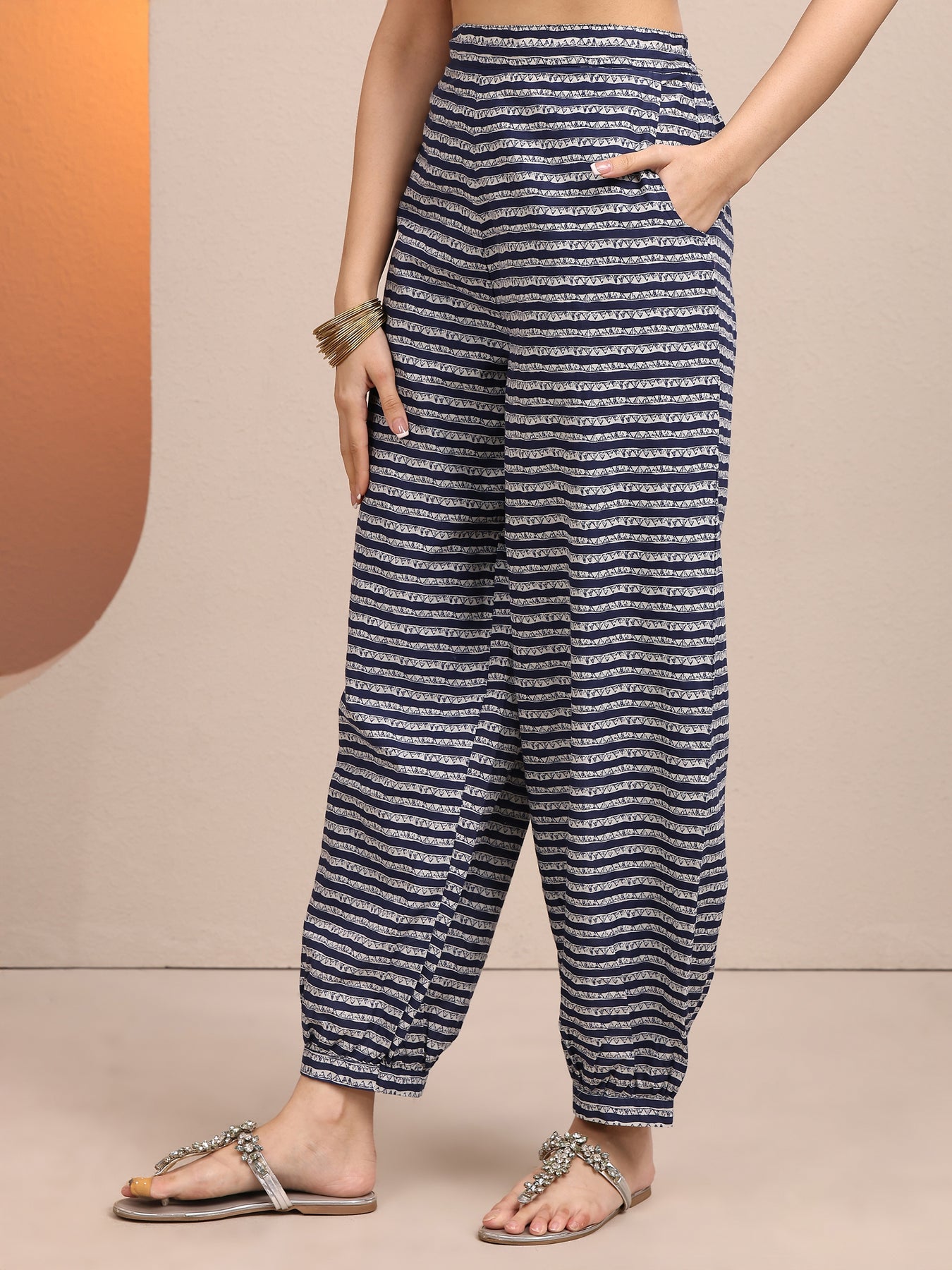 Our 2-piece navy blue cotton straight-fit kurta set features a U-notched neckline, bell sleeves, and statement yoke. Complemented with salwar pants with a partially elasticated waistband. Adorned with floral printed, this style is perfect for work wear and casual wear.