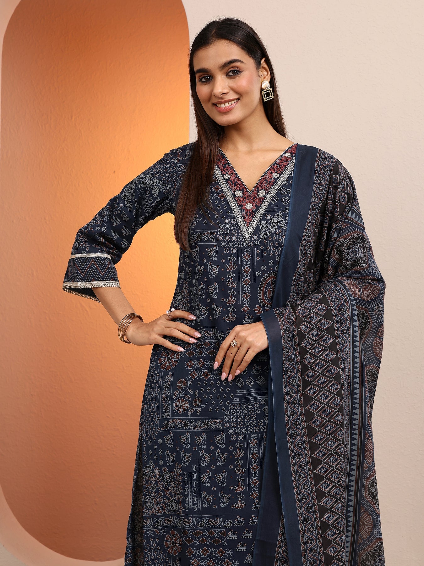 Our 3-piece Navy Blue Cotton Straight-Fit Kurta Set features a V-Neckline, Regular Sleeves, and statement yoke. Complemented with Straight Pants with a Partially Elasticated waistband and 2 pockets, and a Printed dupatta. Adorned with ethnic motif printed, this style is perfect for Work Wear and Casual Wear.