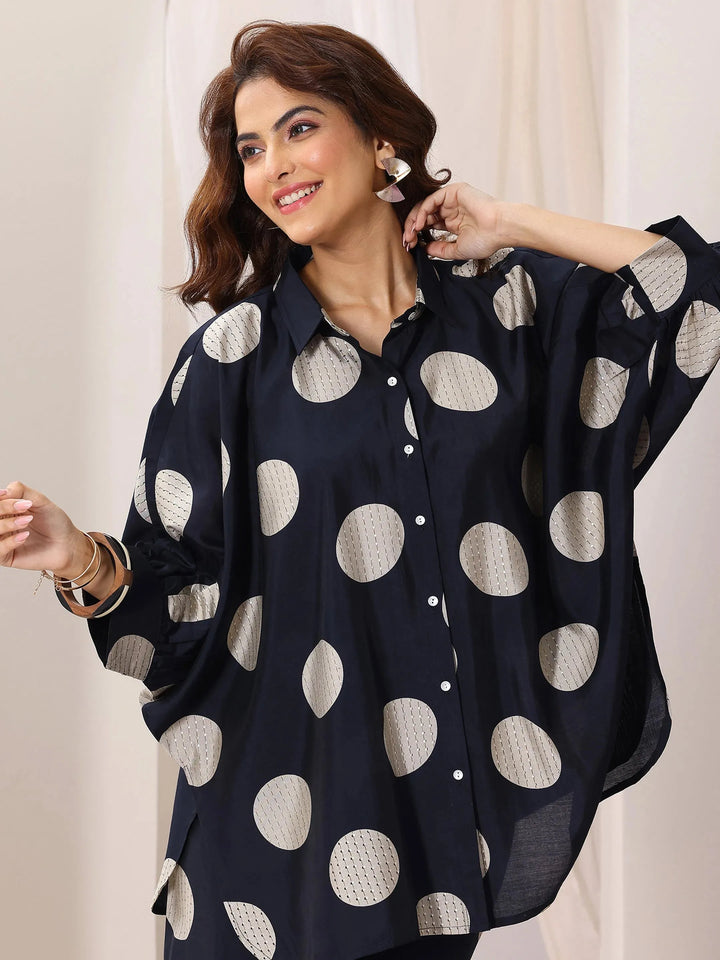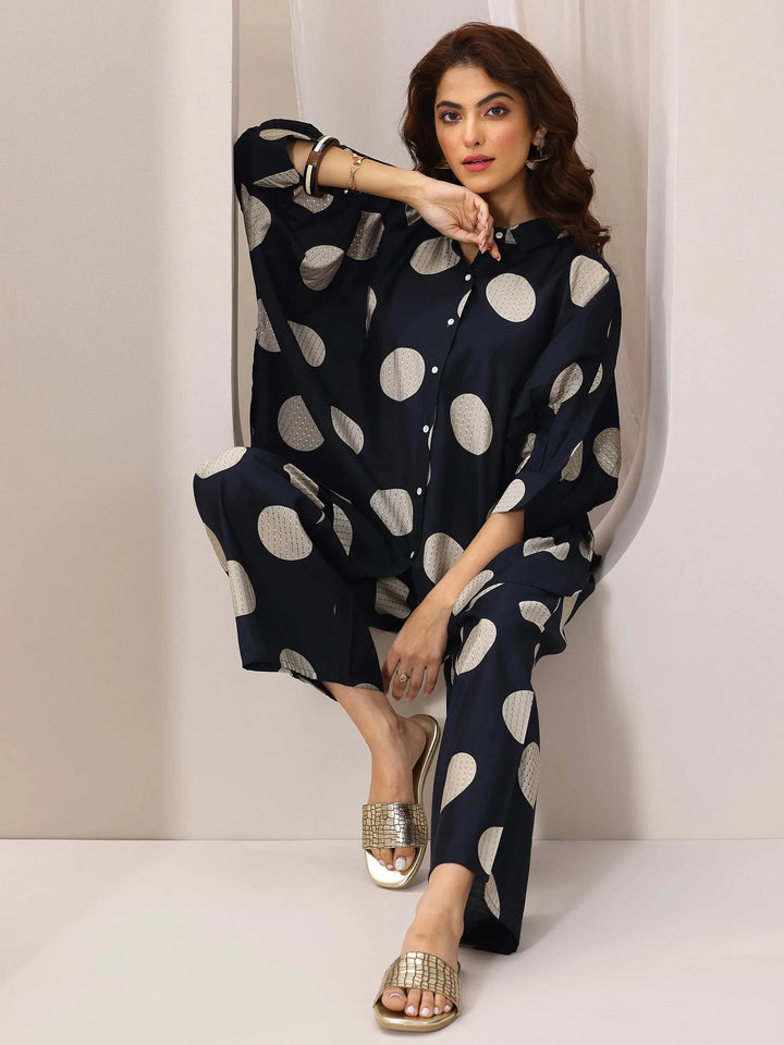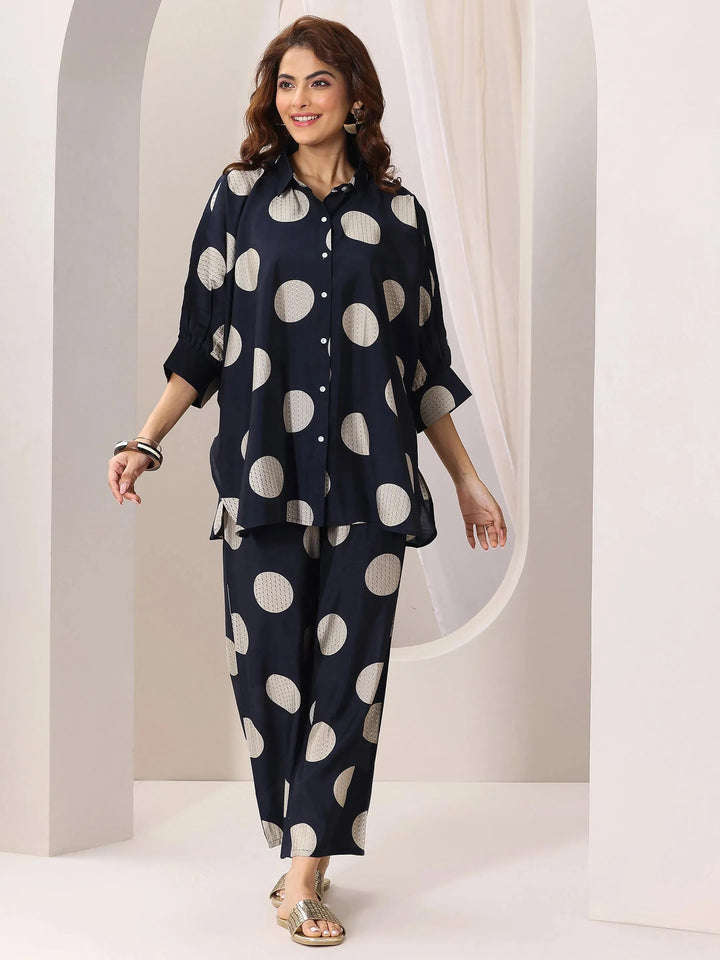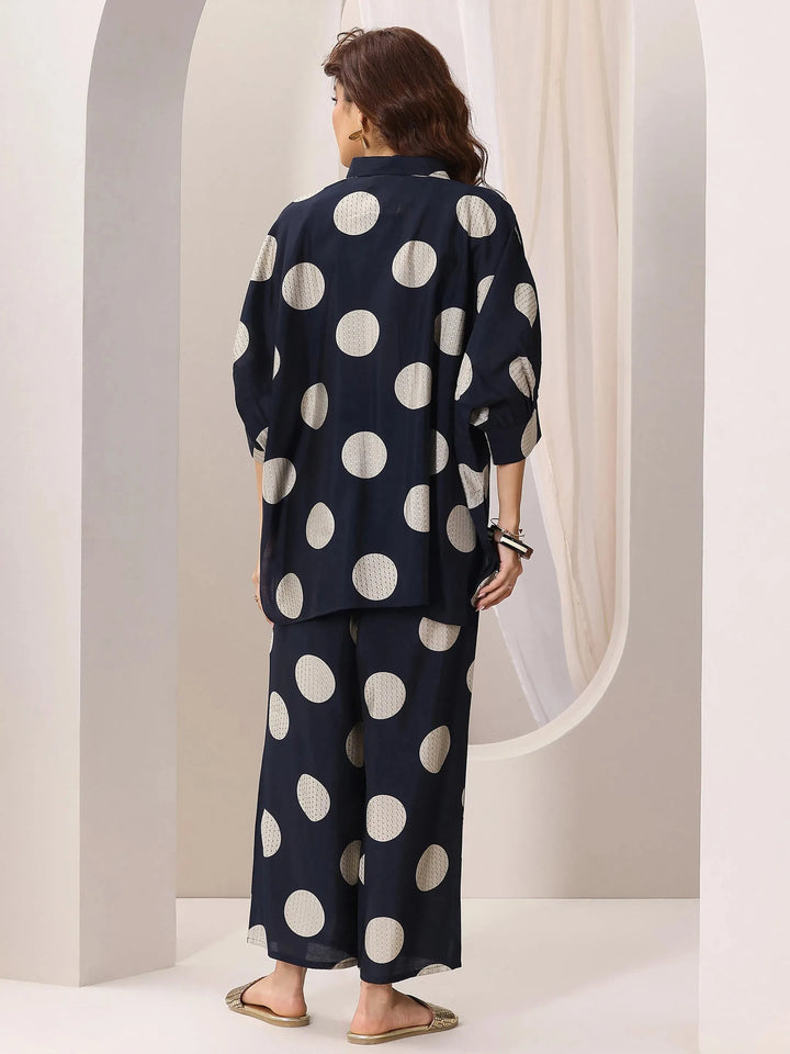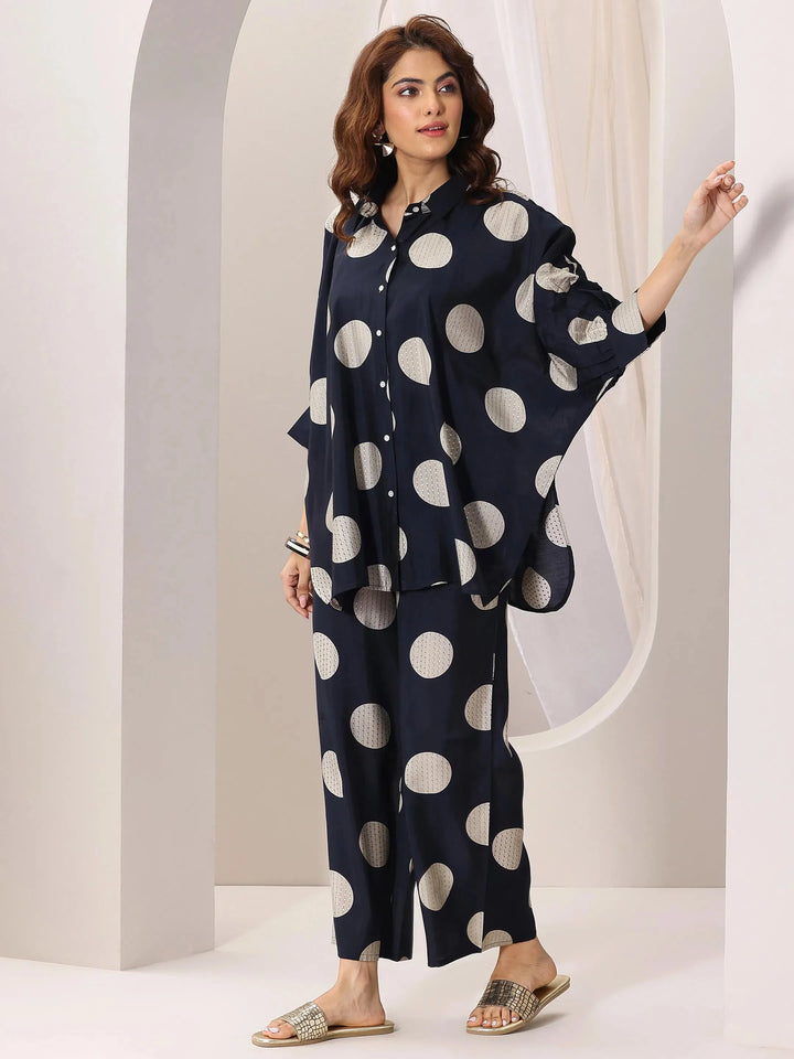 Our 2-piece blue printed rayon co-ord set features a buttoned-down kurta with a shirt collar and three-quarter batwing sleeves. Complemented with matching palazzo pants with a partially elasticated waistband and roomy pockets. Highlighted with stylish buttons, charming sequins accents and large polka dot designs, this style is perfect for casual outings.