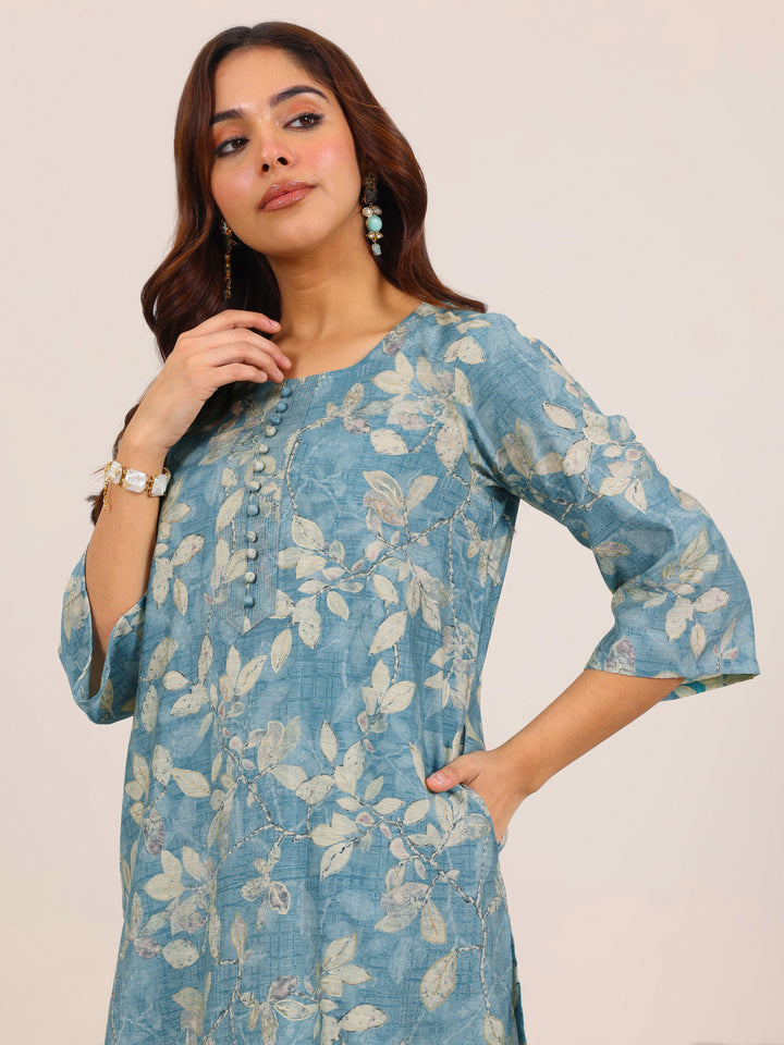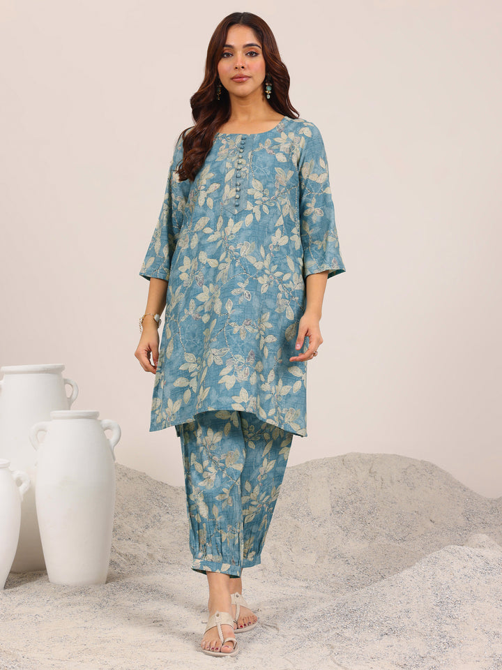 Our 2-piece blue printed silk blend co-ord set features a straight-fit tunic with a round neck neckline and three-quarter sleeves. Complemented with matching salwar with a partially elasticated waistband and 2 pockets. Highlighted with printed embellishments, this style is perfect for festive occasions.