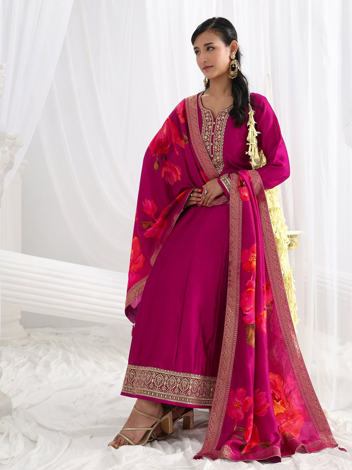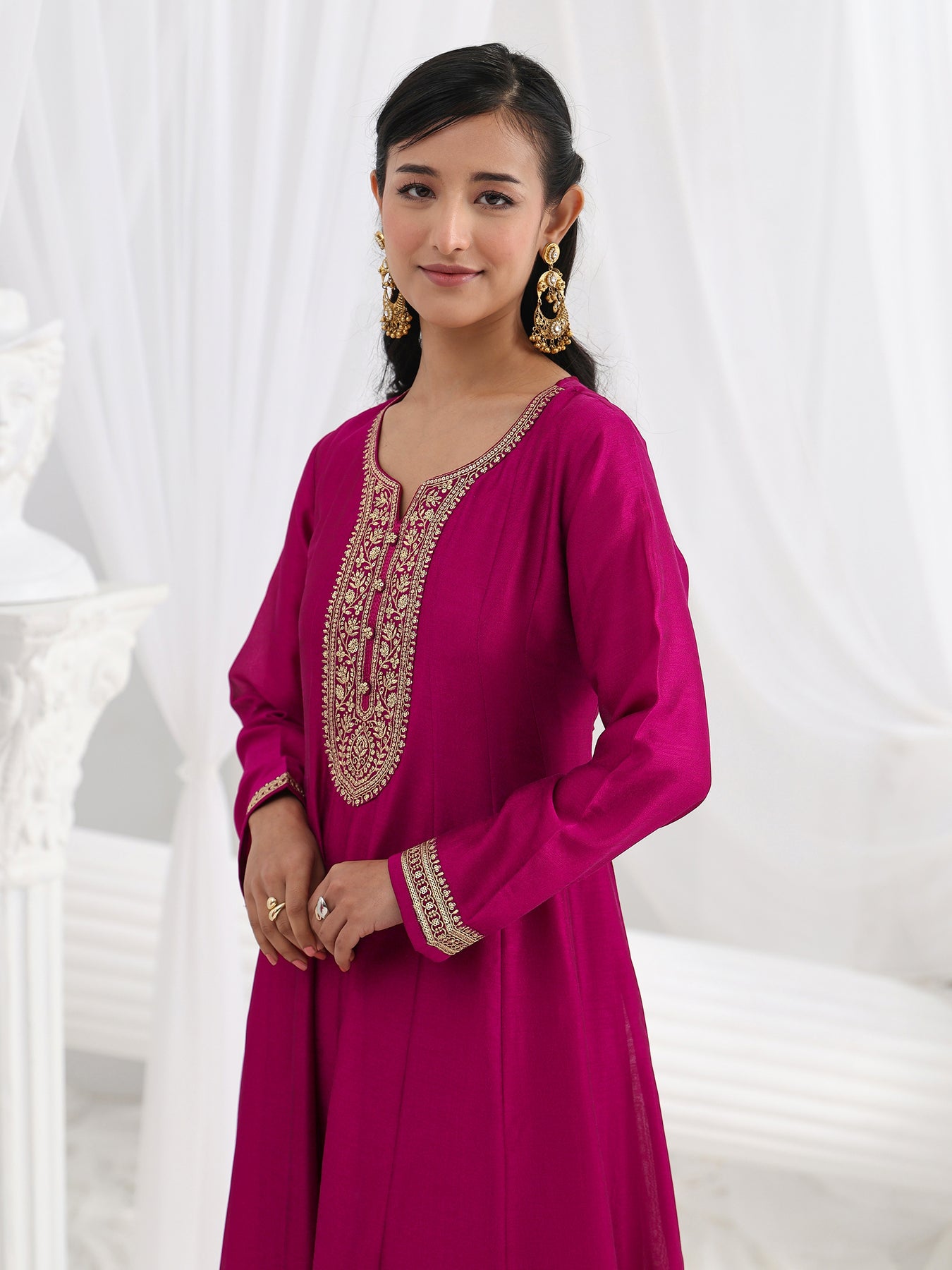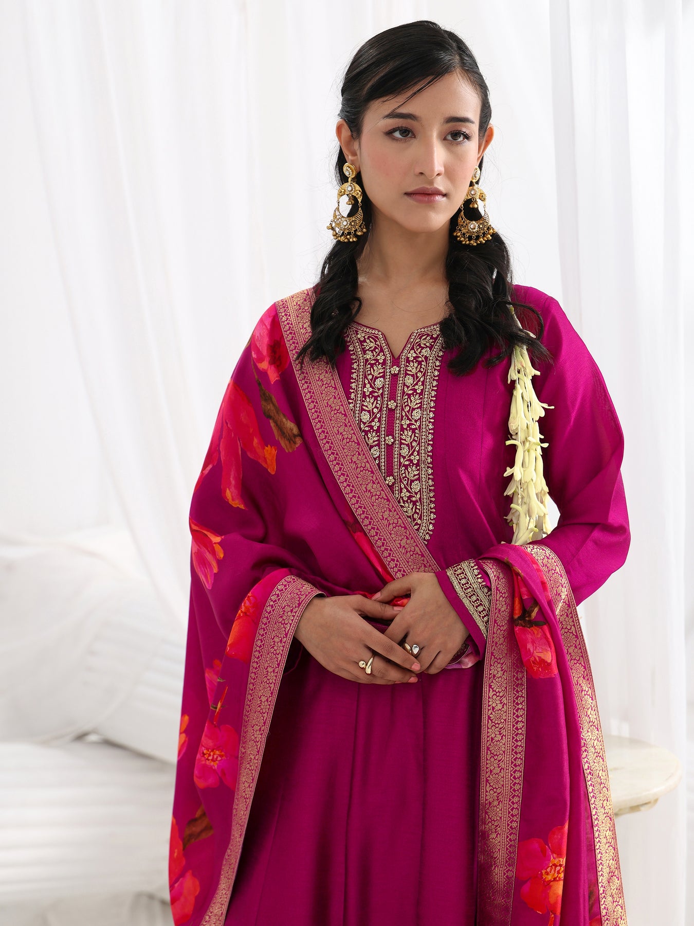 Burgundy Embroidered Silk Blend A-Line Suit Set With Dupatta