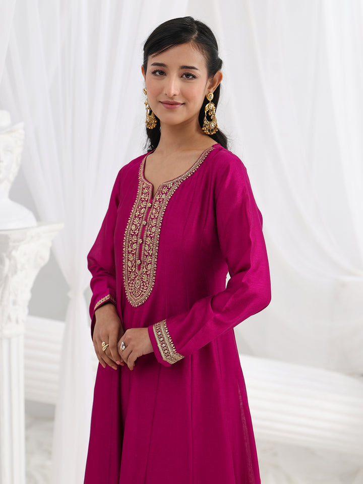 Our 3-piece Pink Silk blend Anarkali Kurta Set features a notched Neckline, Regular Sleeves, and statement Yoke. Complemented with Lining and Straight Pants with a Partially Elasticated waistband and 2 pockets, and a Printed dupatta. Adorned with floral zari embroidered, this style is perfect for Festive occasions.