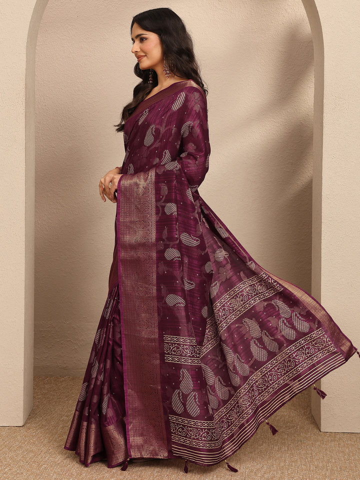 Our burgundy printed silk blend saree features captivating embellishments. Complemented with a Unstitched blouse piece.. This charming saree is perfect for festive occasions.