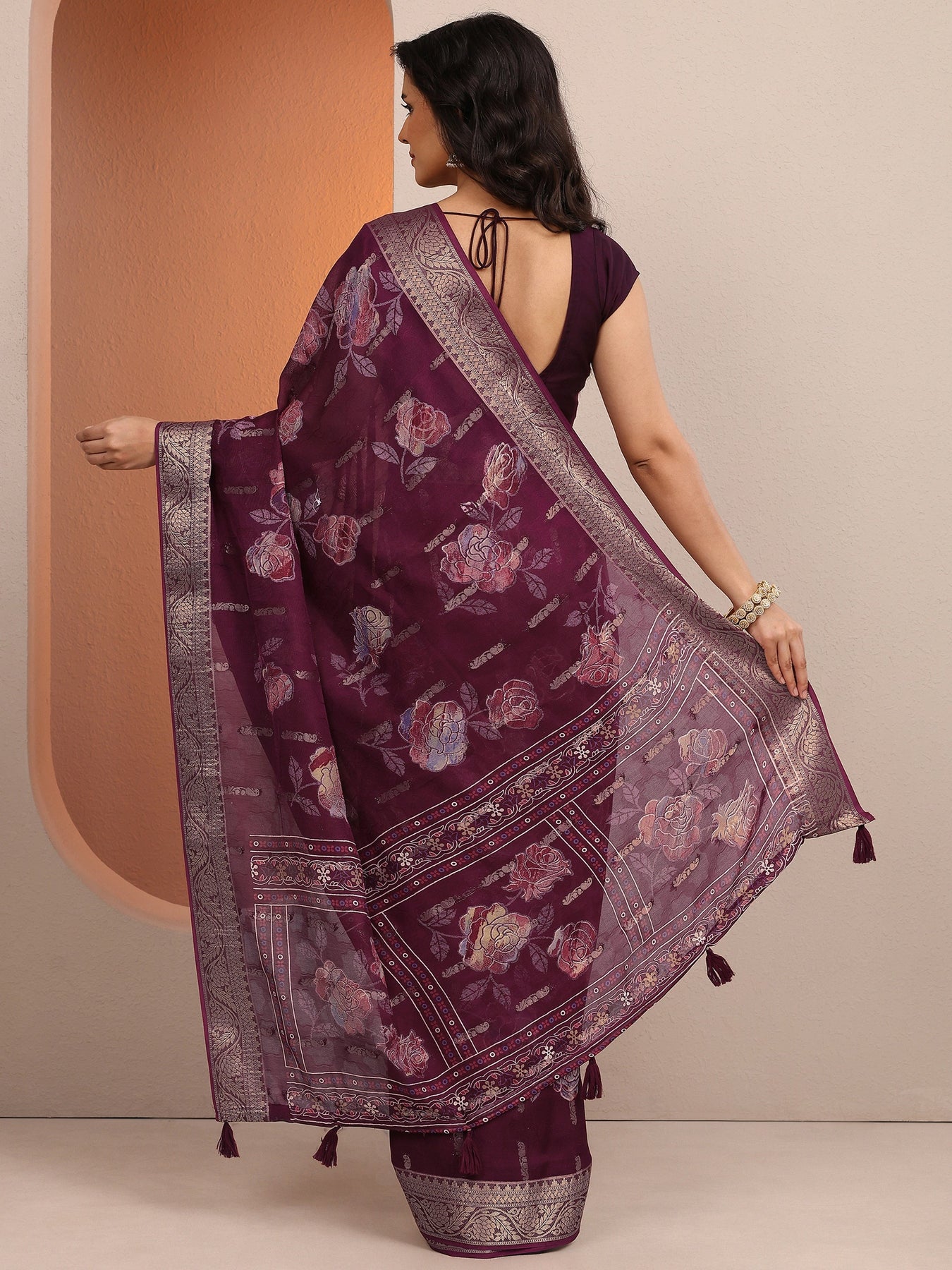 Burgundy Printed Silk Blend Saree With Unstitched Blouse Piece