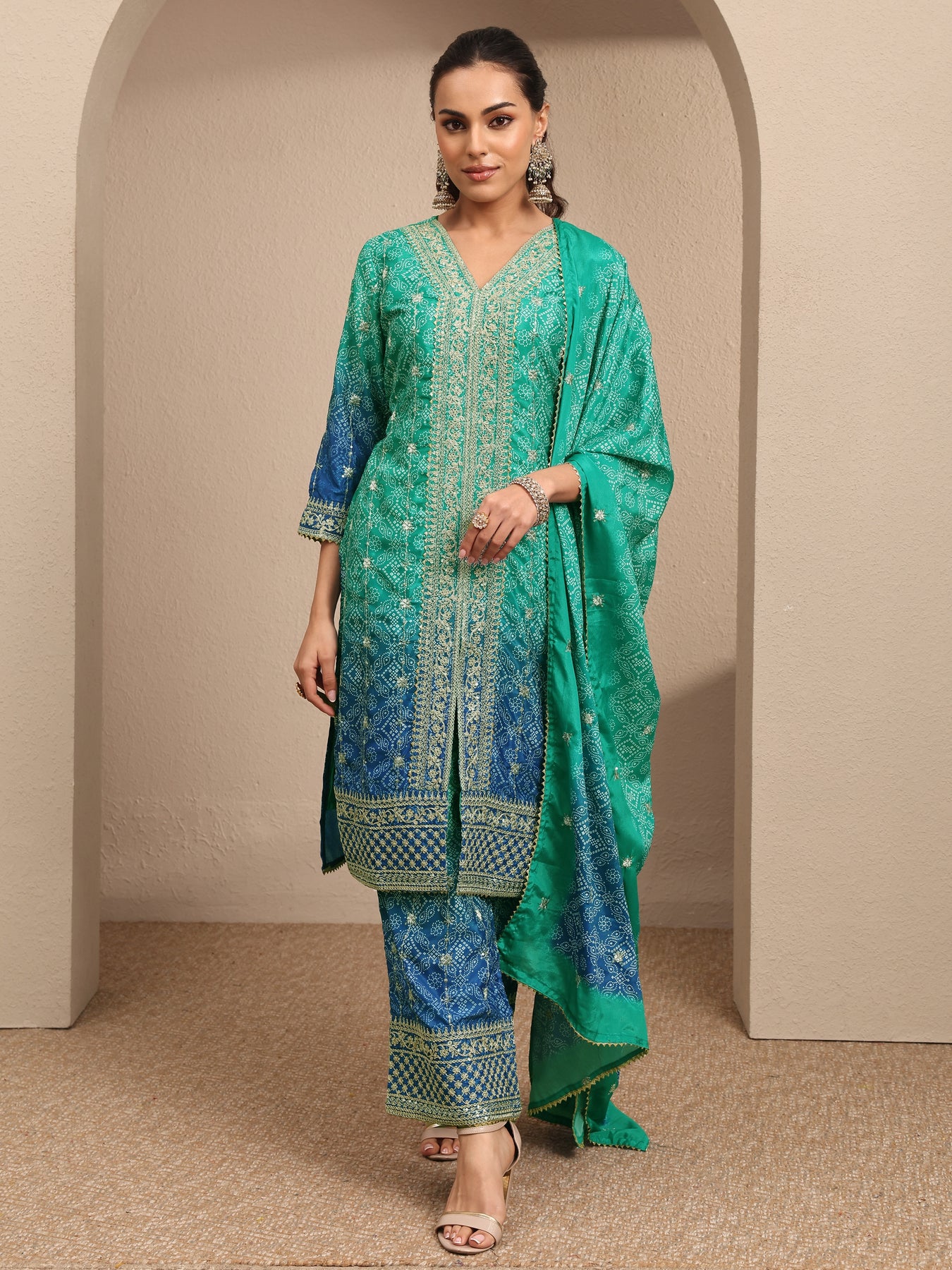 Our 3-piece green and blue Chinon straight-fit kurta set features a V-neckline, regular sleeves, and statement yoke. Complemented with straight pants with a partially elasticated waistband and 2 pockets, and a printed dupatta. Adorned with bandhani printed, this style is perfect for festive occasions.