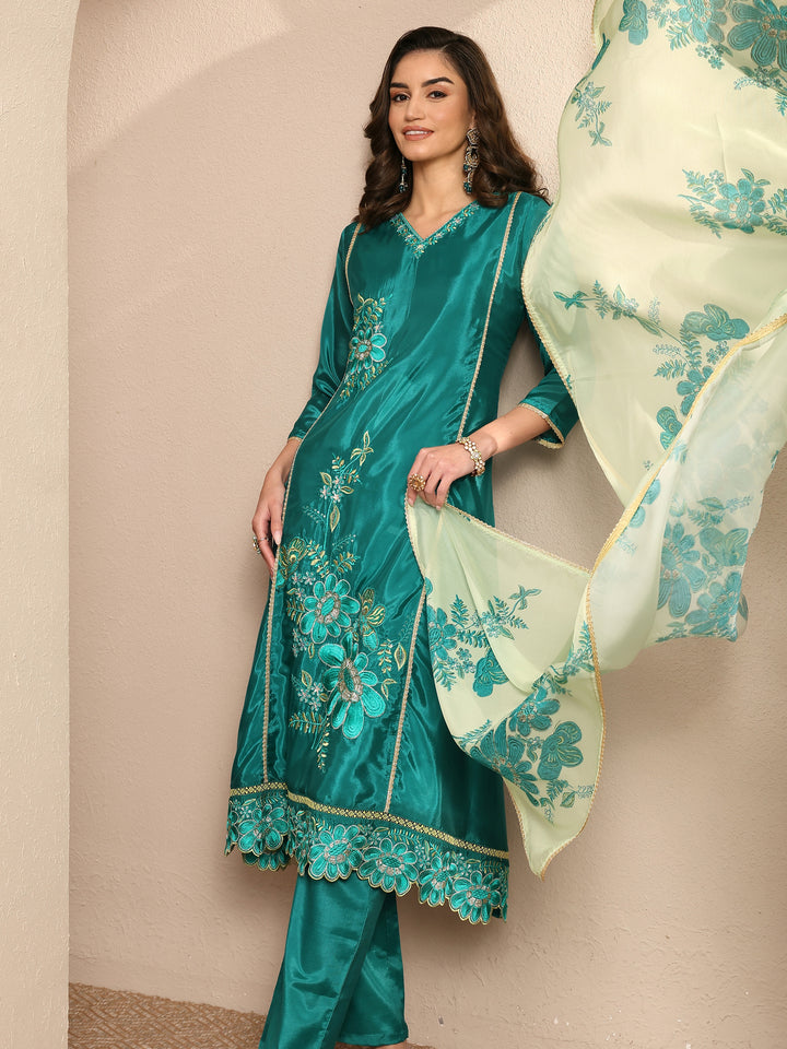 Green Embroidered Crepe A-line Suit Set With Dupatta