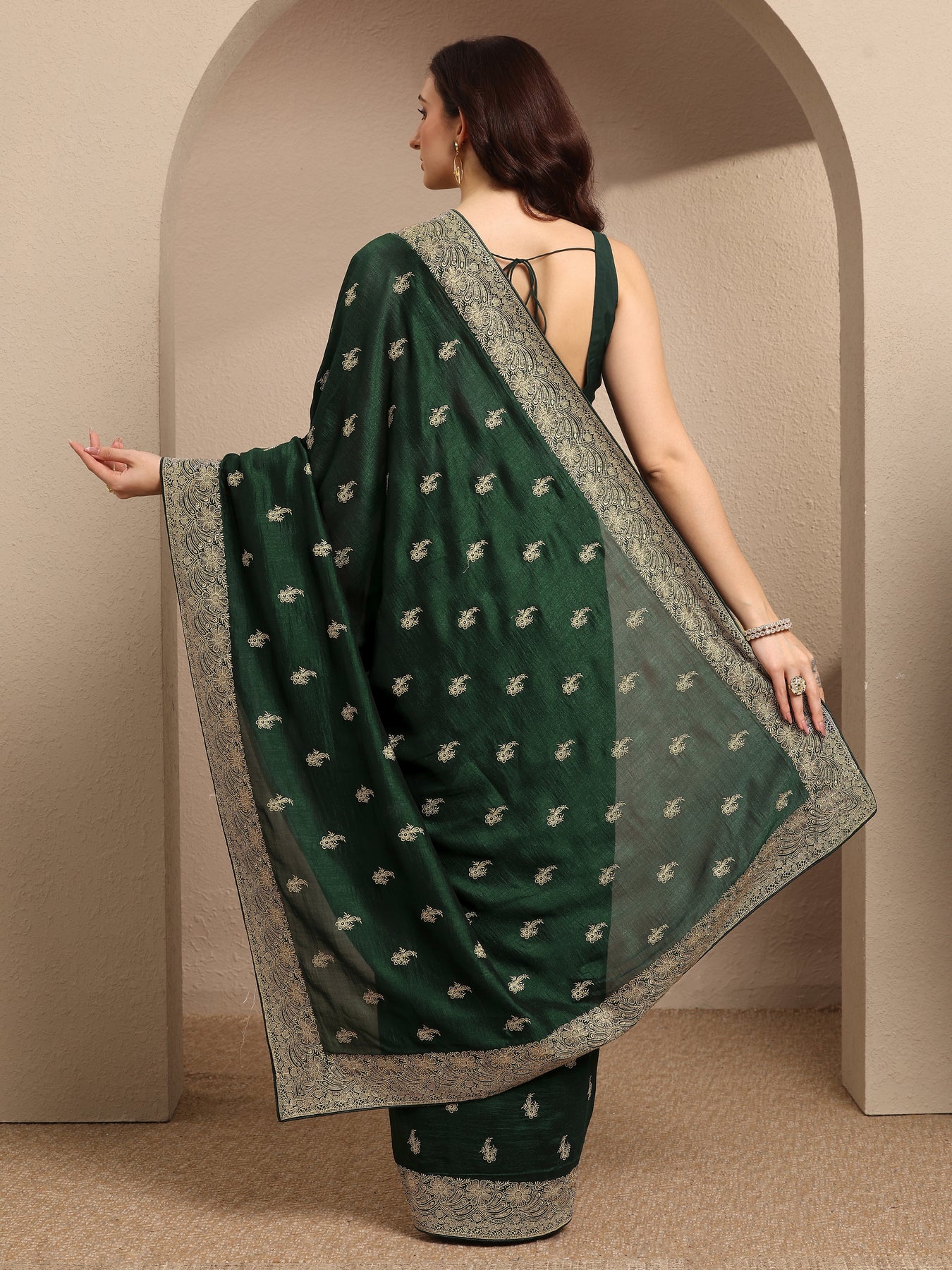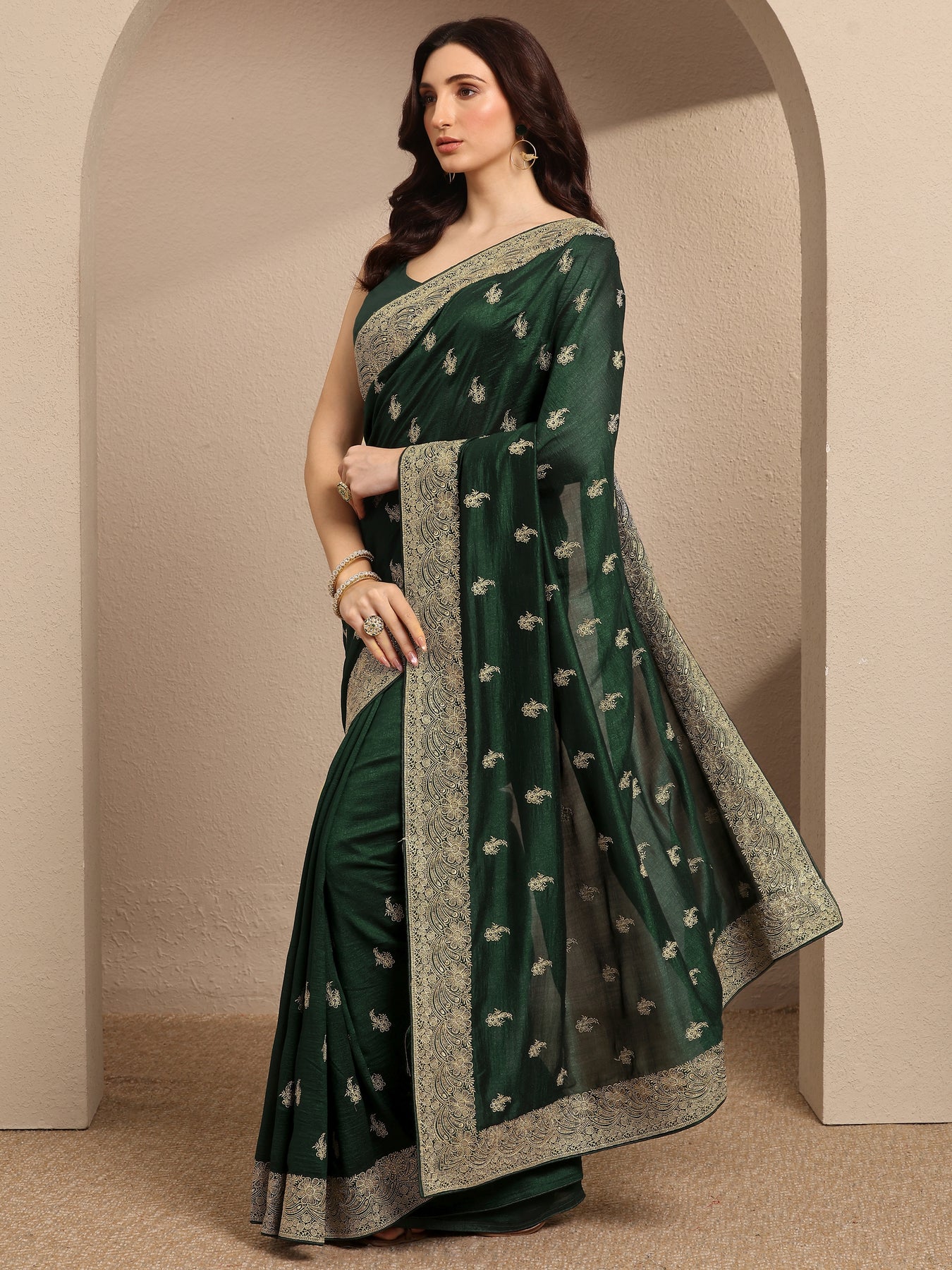 Our bottle green printed silk blend saree features captivating embellishments. Complemented with a Unstitched blouse piece.. This charming saree is perfect for festive occasions.