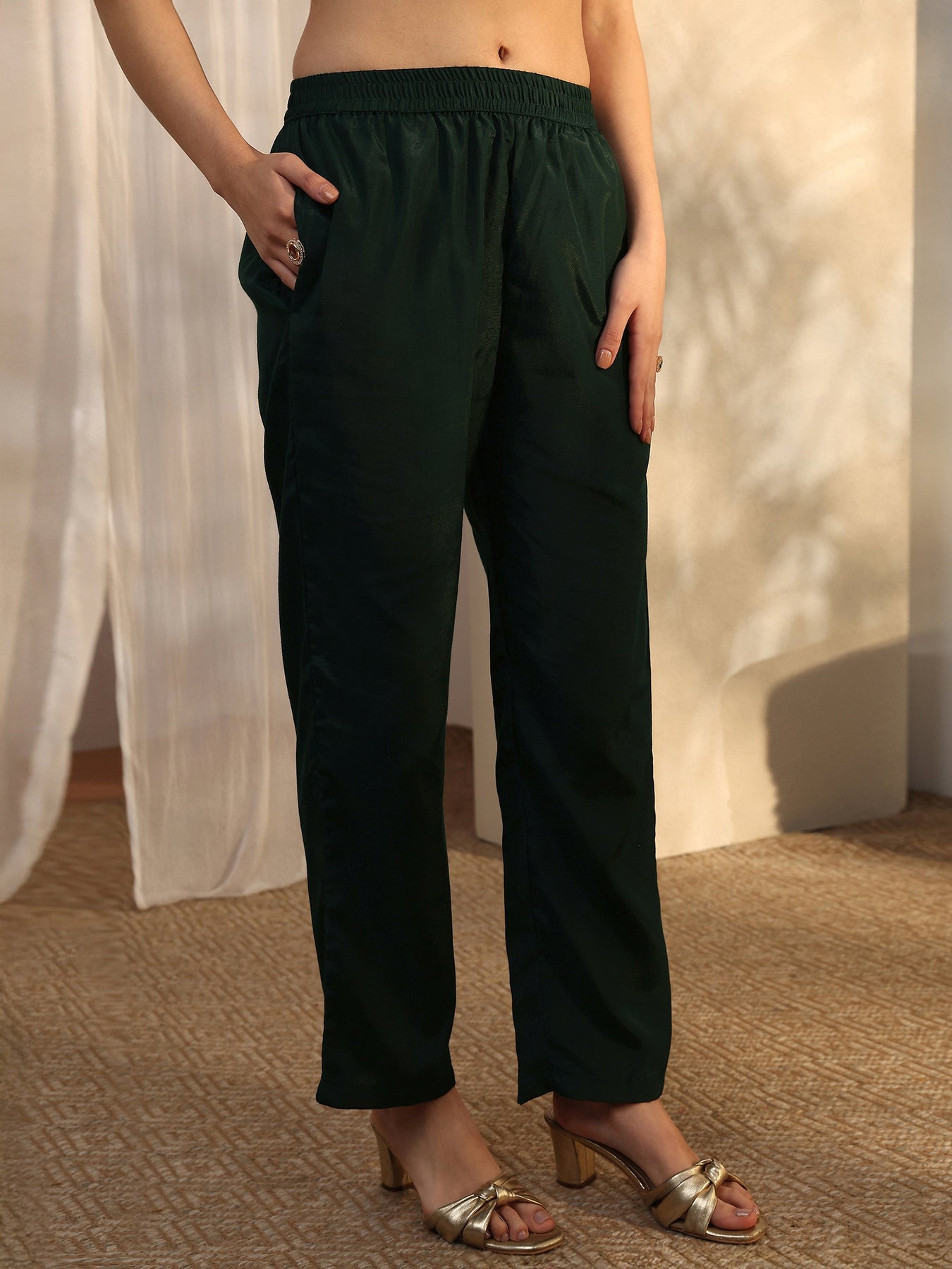 Our 3-piece Bottle Green Silk blend Straight-fit Kurta Set features a Round Neckline, Regular Sleeves, and statement yoke. Complemented with Straight Pants with a Partially Elasticated waistband and 2 pockets, and an Embroidered dupatta. Adorned with ethnic motif embroidered, this style is perfect for Dark Festive.