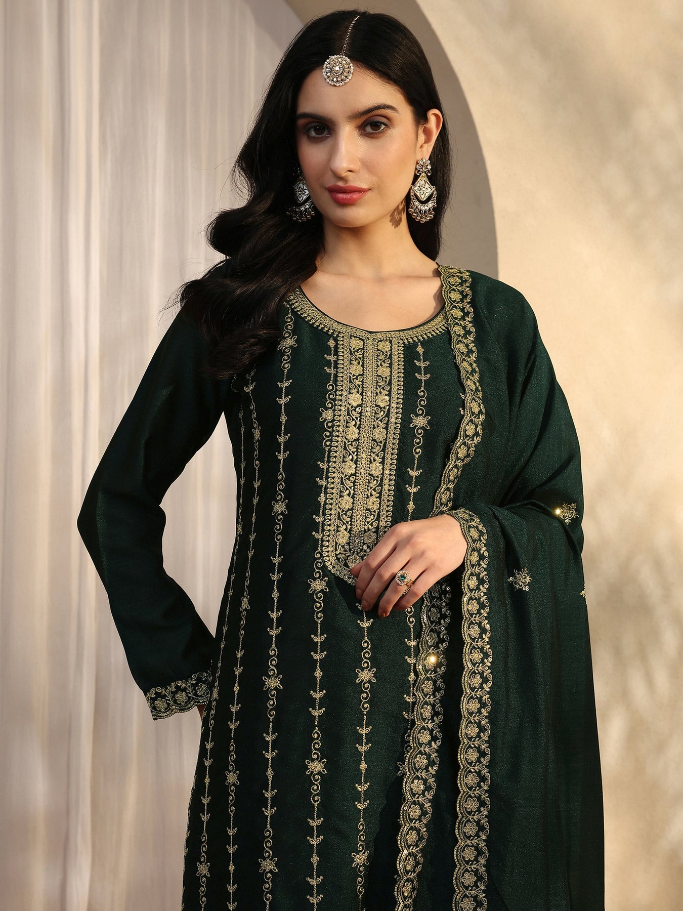 Green Embroidered Silk Blend Straight Suit Set With Dupatta