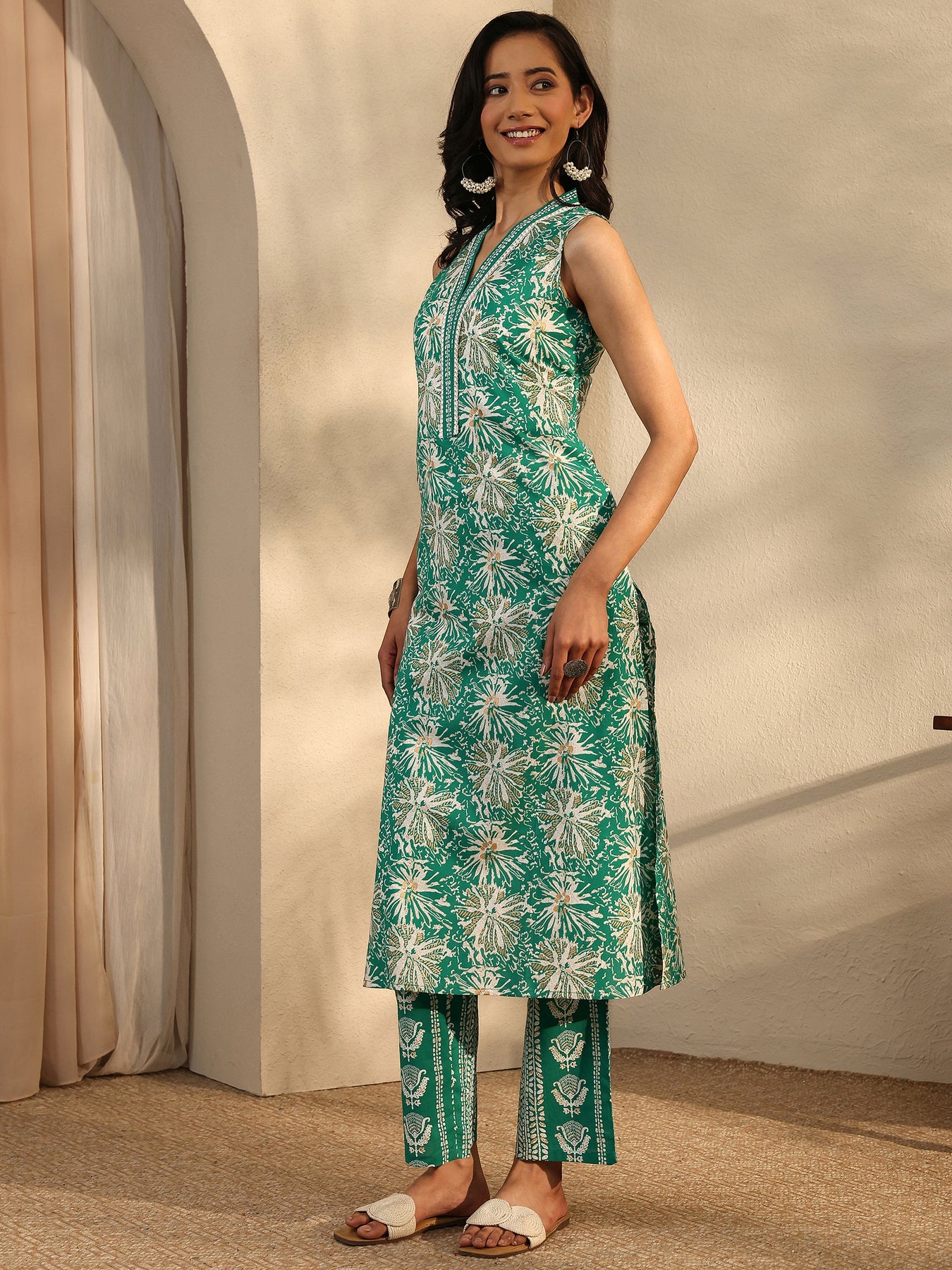 Green Printed Cotton Straight Kurta Set