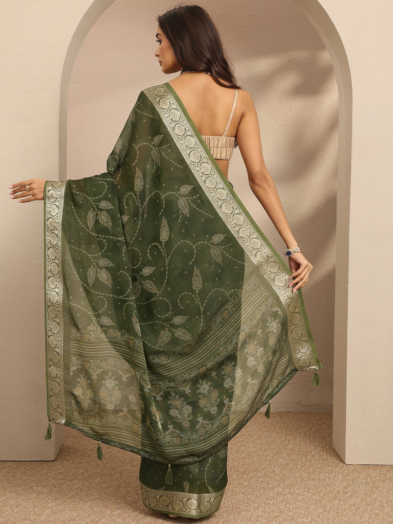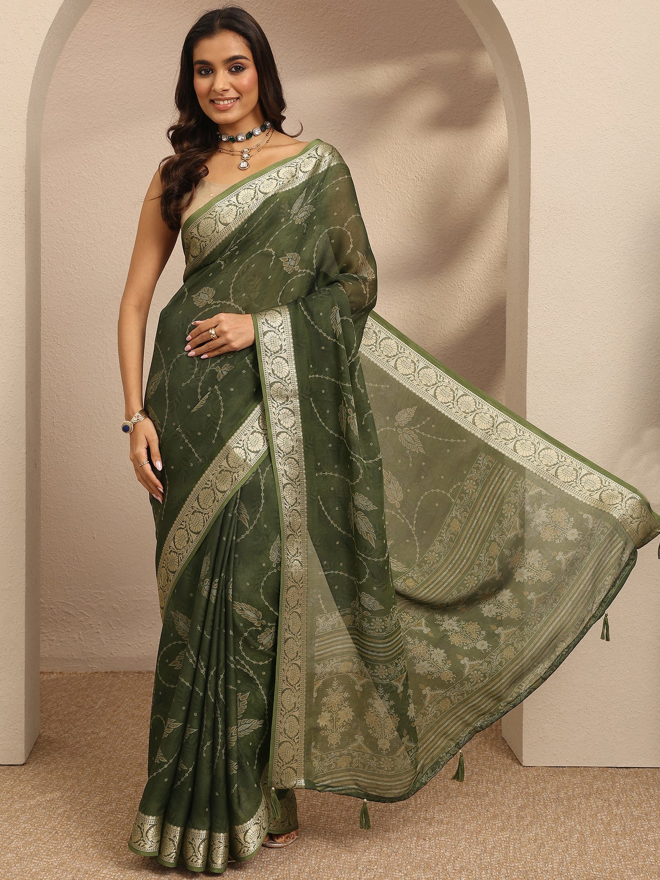 Our olive printed Georgette saree features captivating floral print. Complemented with a Blouse Piece. This charming saree is perfect for festive occasions.