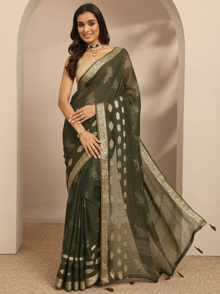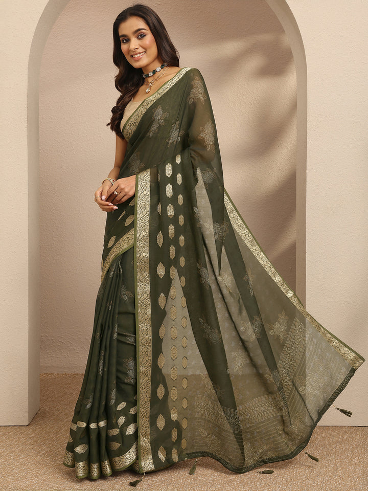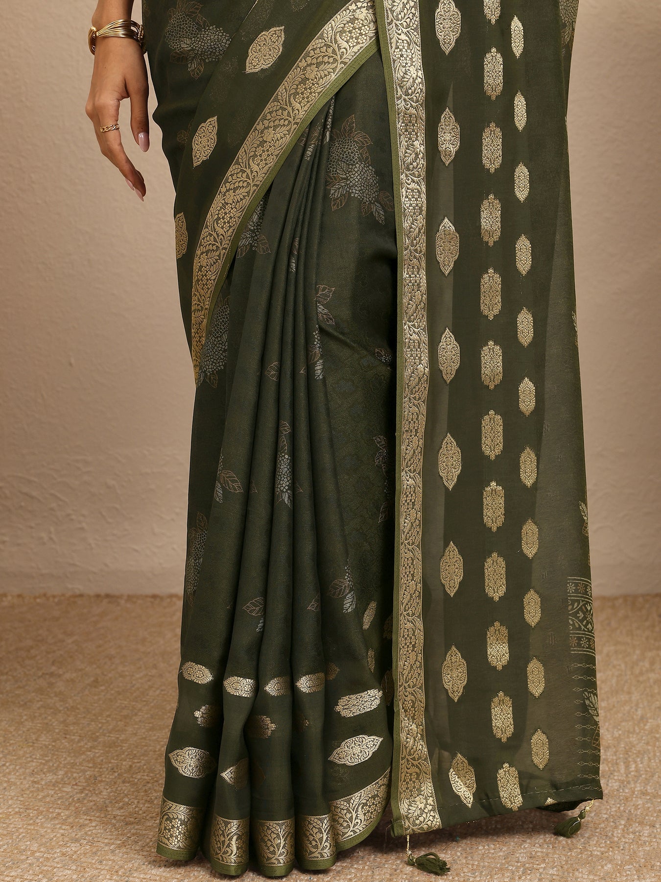 Our olive printed Georgette saree features captivating embellishments. Complemented with a Blouse Piece. This charming saree is perfect for festive occasions.